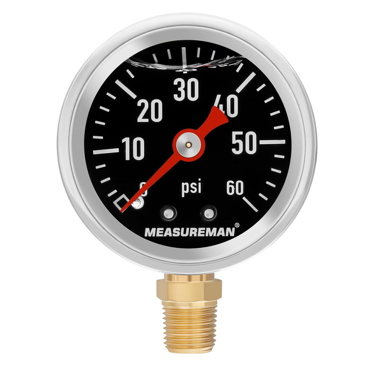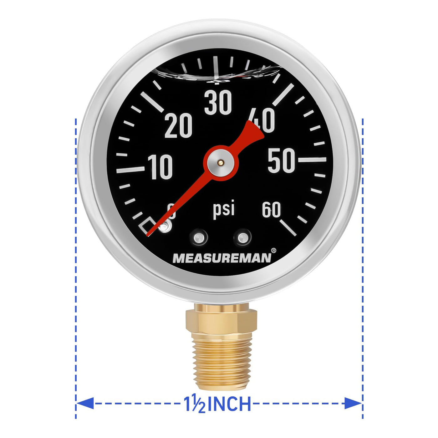 Description This mini pressure gauge is designed for fuel in automative replacement industry, which is used for measuring the fuel pressure. Dial size: 1-1/2'' Process connection: 1/8''NPT male lower Case: 304 stainless steel case and crimped ring Window: Polycarbonate Dial plate: aluminum, with pointer stop Pointer: Aluminum, black, DIN style Bourdon tube: Copper alloy Movement: Brass Connection: Brass,two pieces design Oil cap: rubber, black color Filling: Glycerin filled, dampens the effect of vibration and pulsation; lubricates the movement and extends the life of gauge. IP class: IP67 Accuracy:+/-3-2-3%, Pressure range: 0-60psi single scale Working temperature:-4 to 140 deg F/-20 to 60 deg C Ambient temperature:140 deg F/60 deg C maximum Measureman has 20 years rich experience in the measuring of pressure, temperature, flow, level industries, The ''Measureman'' branded products are the combination of continuous good quality and affordable price. ''Measureman'' products are selected and designed by professional engineers.