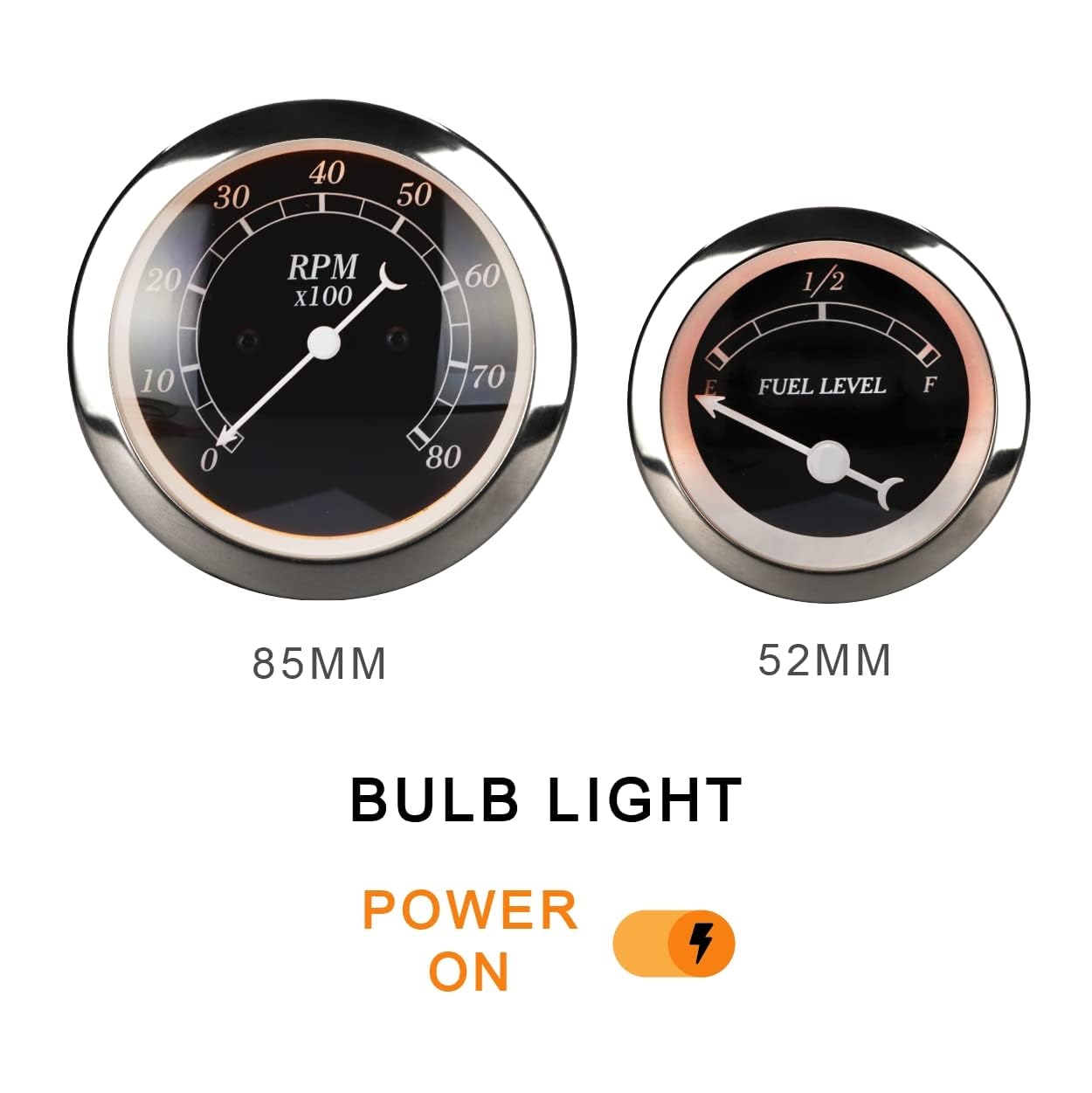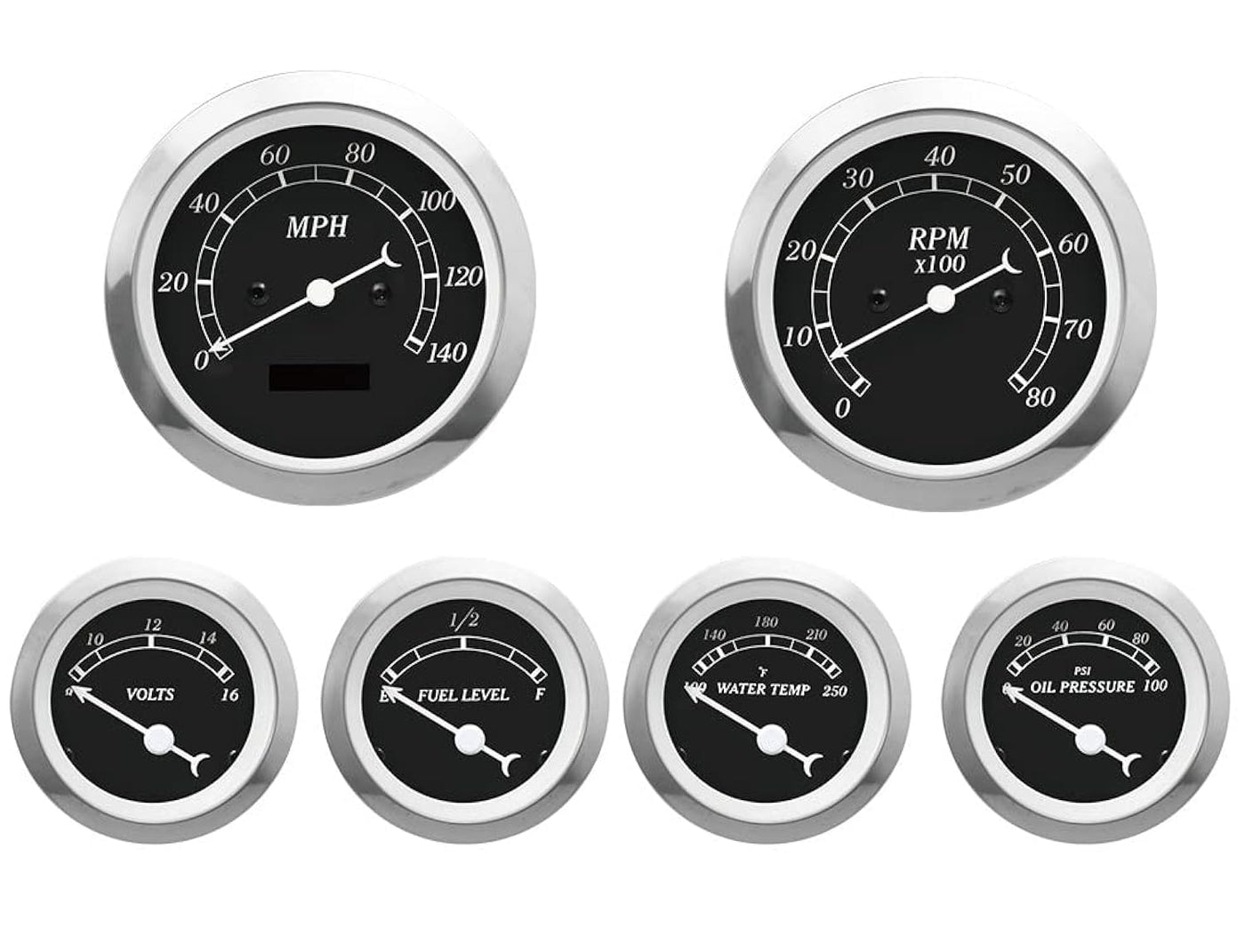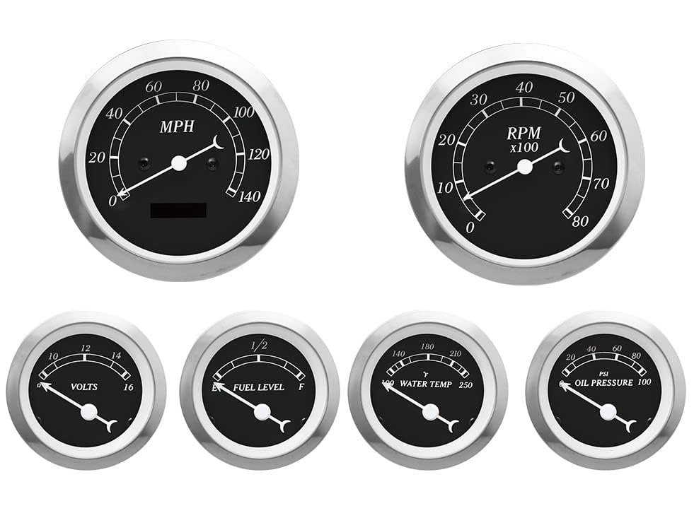 MOTOR METER RACING Classic Series 6 Gauge Set is Designed For Vintage Style, Features 6 Most Essential Gauges For Any Car or Truck's Instrument Cluster - Includes 85mm Speedometer & Tachometer - 52mm Voltage, Fuel Level, Water Temperature & Oil Pressure Gauge. Classic 6 Gauge Set is Designed with Convex Clear Acrylic Lens, Stainless Steel Bezel & Plastic Housing. The Swiss Stepper Movement Provides Stable Performance.