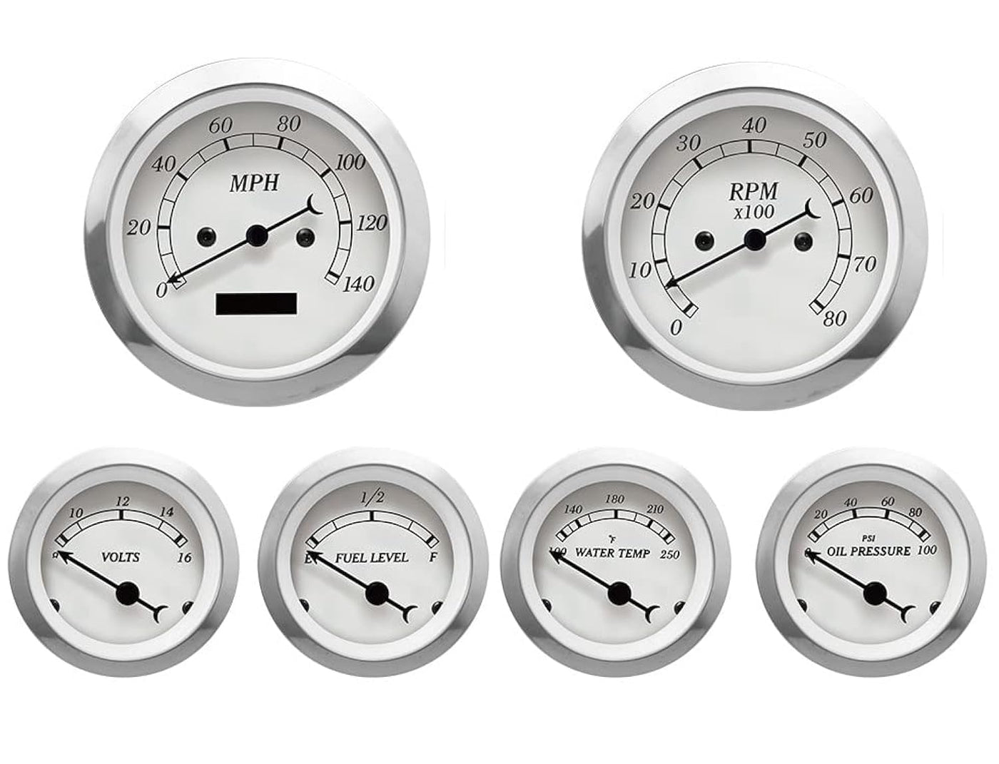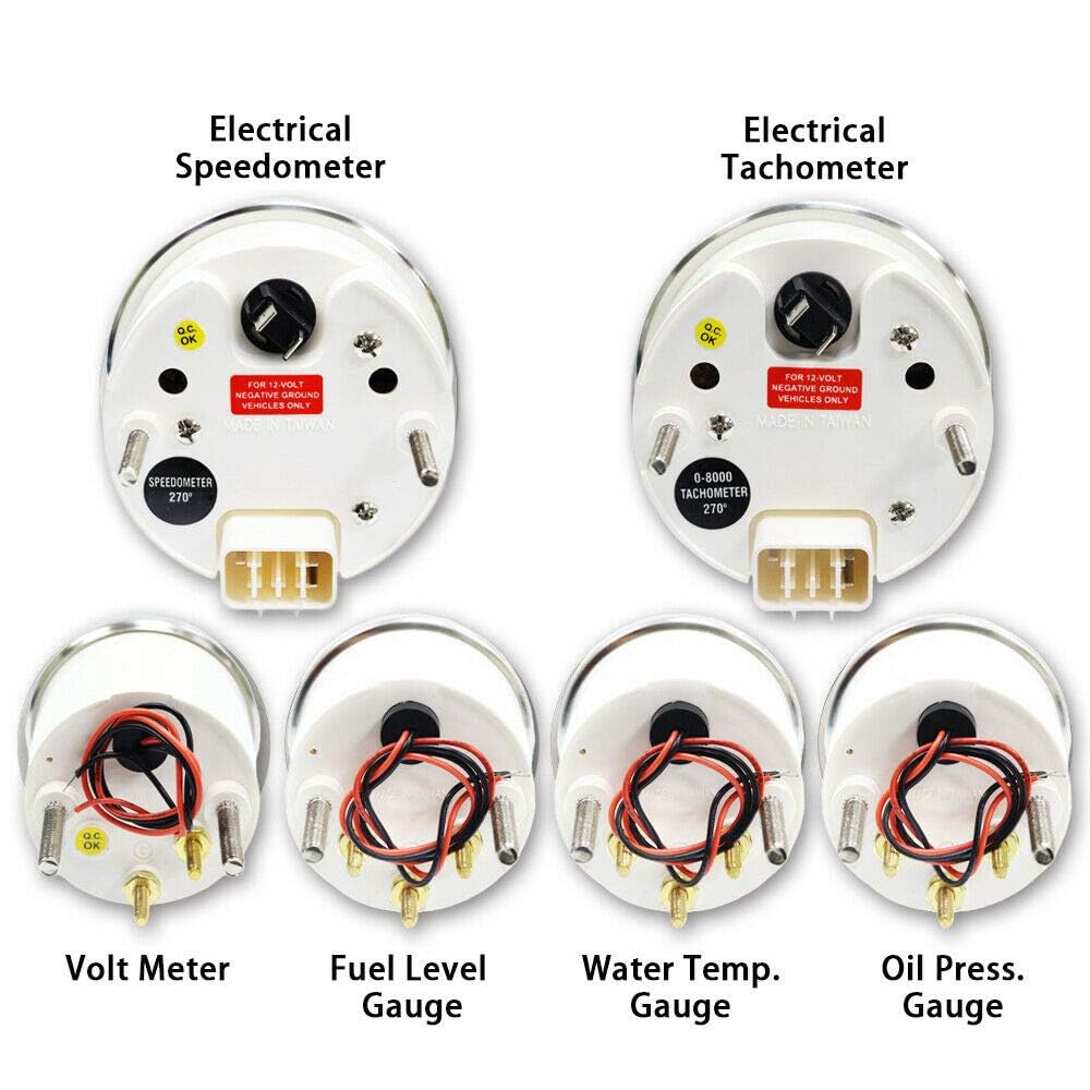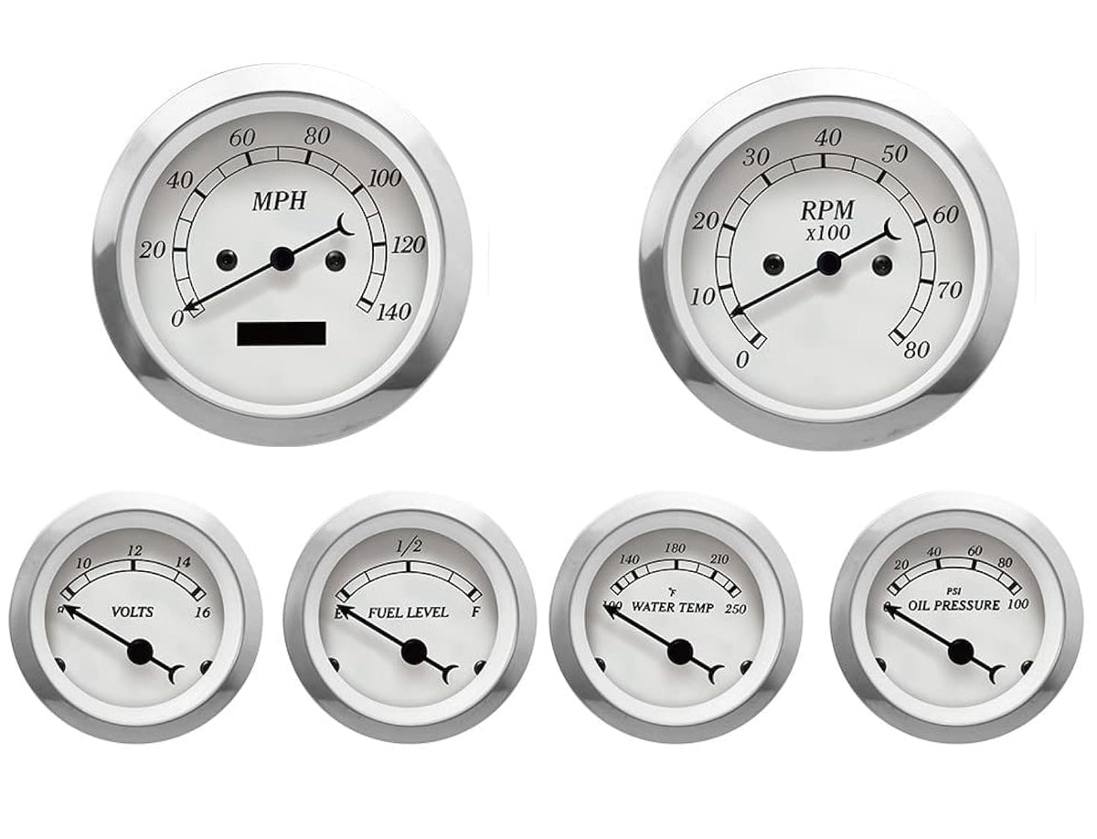 MOTOR METER RACING Classic Series 6 Gauge Set is Designed For Vintage Style, Features 6 Most Essential Gauges For Any Car or Truck's Instrument Cluster - Includes 85mm Speedometer & Tachometer - 52mm Voltage, Fuel Level, Water Temperature & Oil Pressure Gauge. Classic 6 Gauge Set is Designed with Convex Clear Acrylic Lens, Stainless Steel Bezel & Plastic Housing. The Swiss Stepper Movement Provides Stable Performance.
