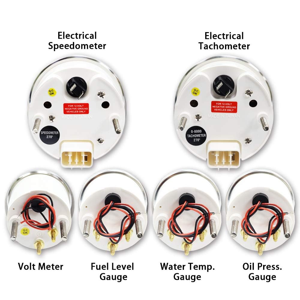 MOTOR METER RACING Classic Series 6 Gauge Set is Designed For Vintage Style, Features 6 Most Essential Gauges For Any Car or Truck's Instrument Cluster - Includes 85mm Speedometer & Tachometer - 52mm Voltage, Fuel Level, Water Temperature & Oil Pressure Gauge. Classic 6 Gauge Set is Designed with Convex Clear Acrylic Lens, Stainless Steel Bezel & Plastic Housing. The Swiss Stepper Movement Provides Stable Performance.