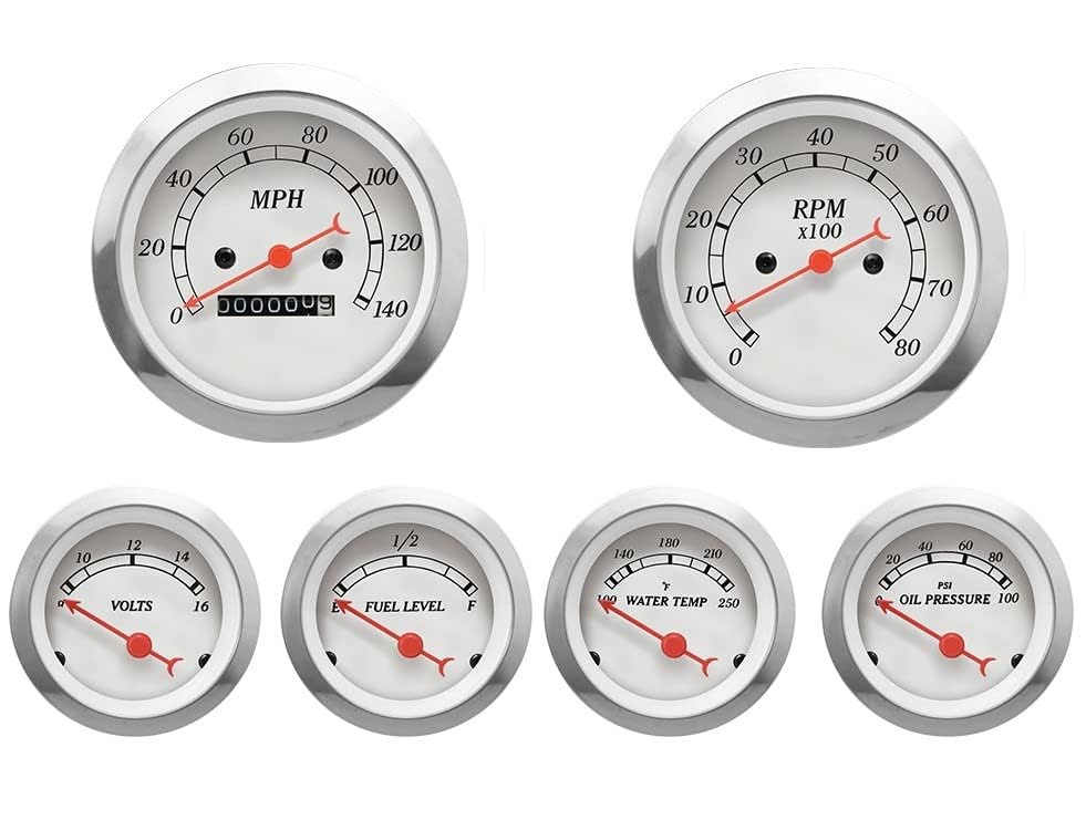 MOTOR METER RACING Classic Series 6 Gauge Set is Designed For Vintage Style, Features 6 Most Essential Gauges For Any Car or Truck's Instrument Cluster - Includes 85mm Speedometer & Tachometer - 52mm Voltage, Fuel Level, Water Temperature & Oil Pressure Gauge. Classic 6 Gauge Set is Designed with Convex Clear Acrylic Lens, Stainless Steel Bezel & Plastic Housing. The Swiss Stepper Movement Provides Stable Performance.