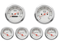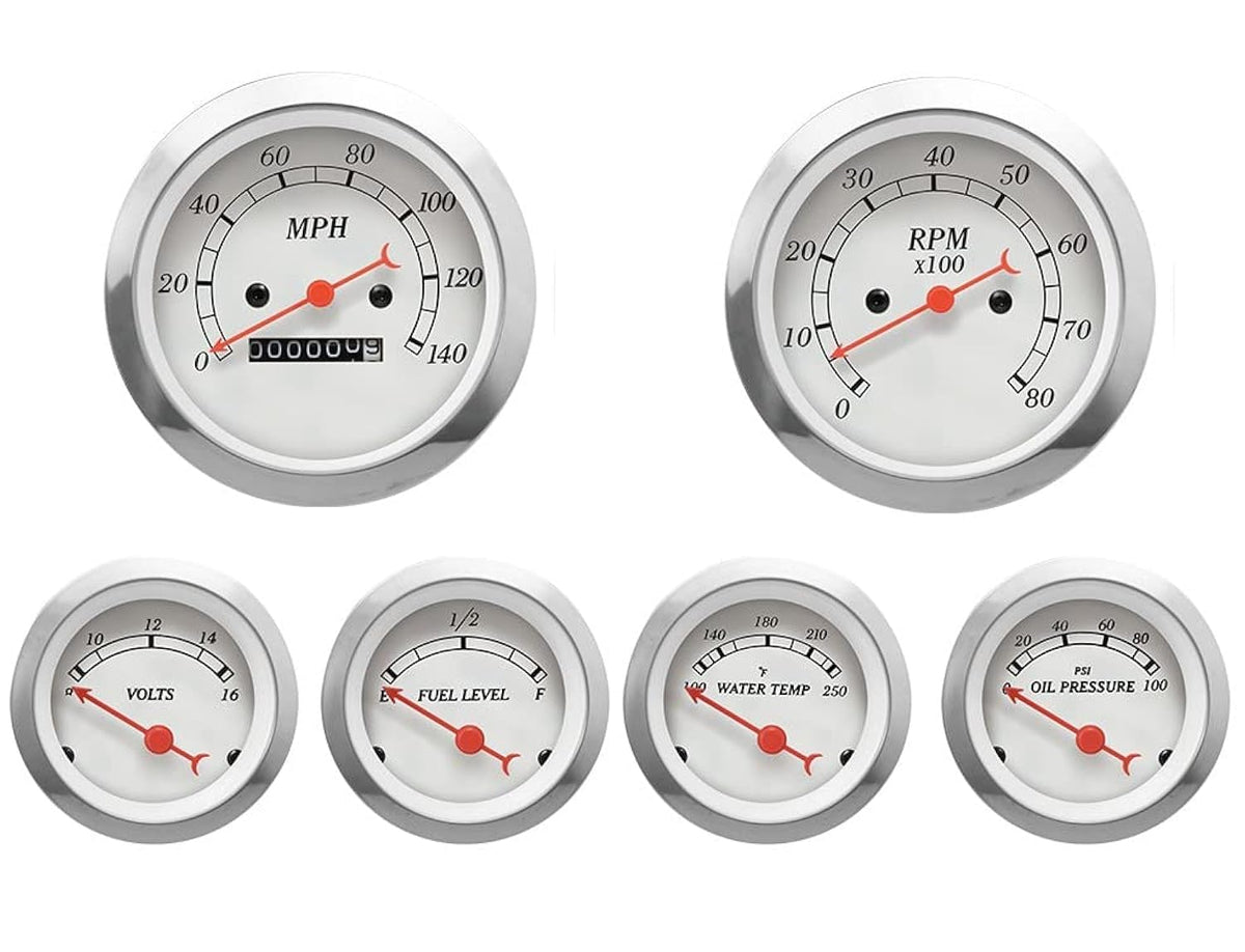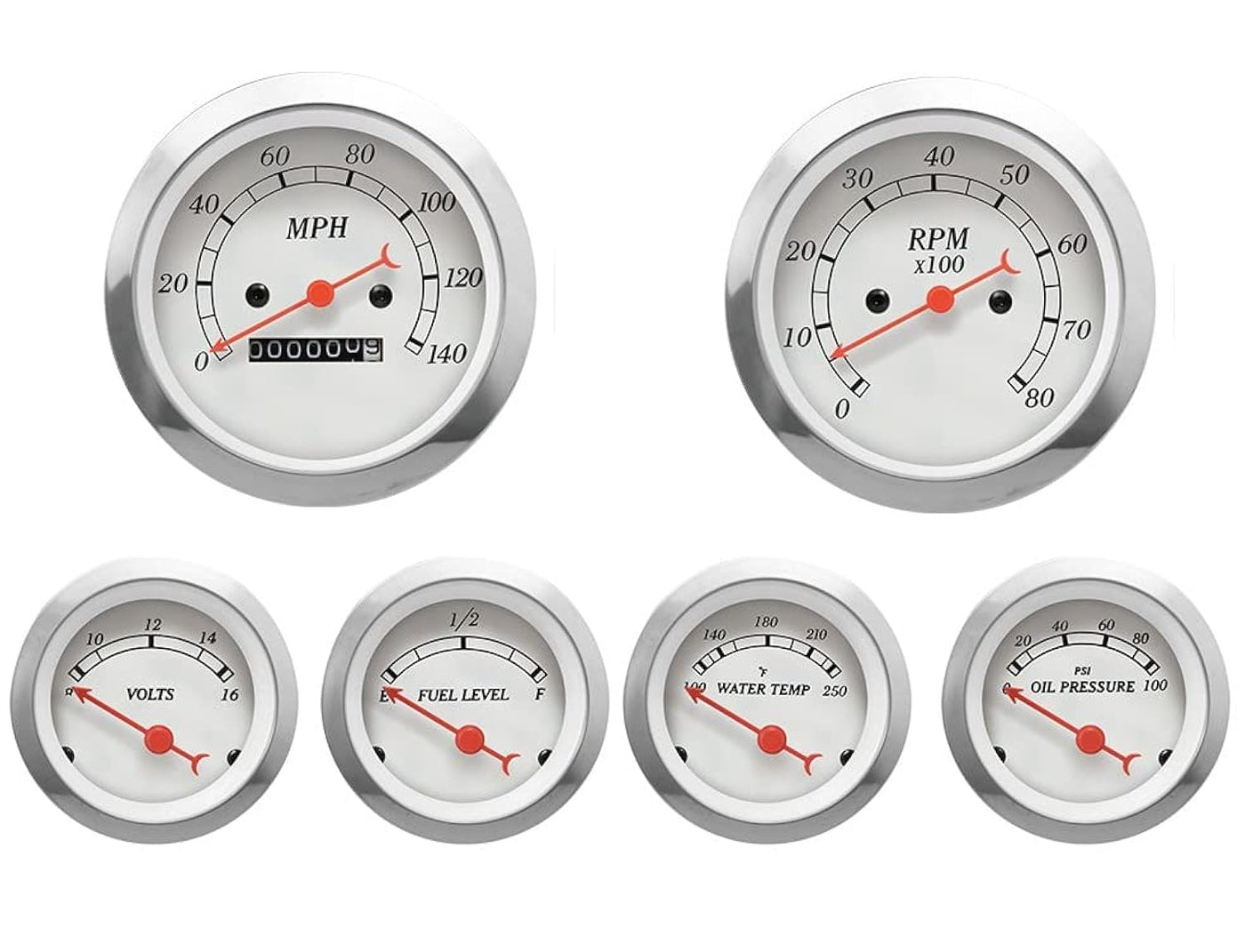 MOTOR METER RACING Classic 6 Gauge Set with Mechanical Speedometer Analog Odometer White Dial Red Needle Light Bulb Illumination