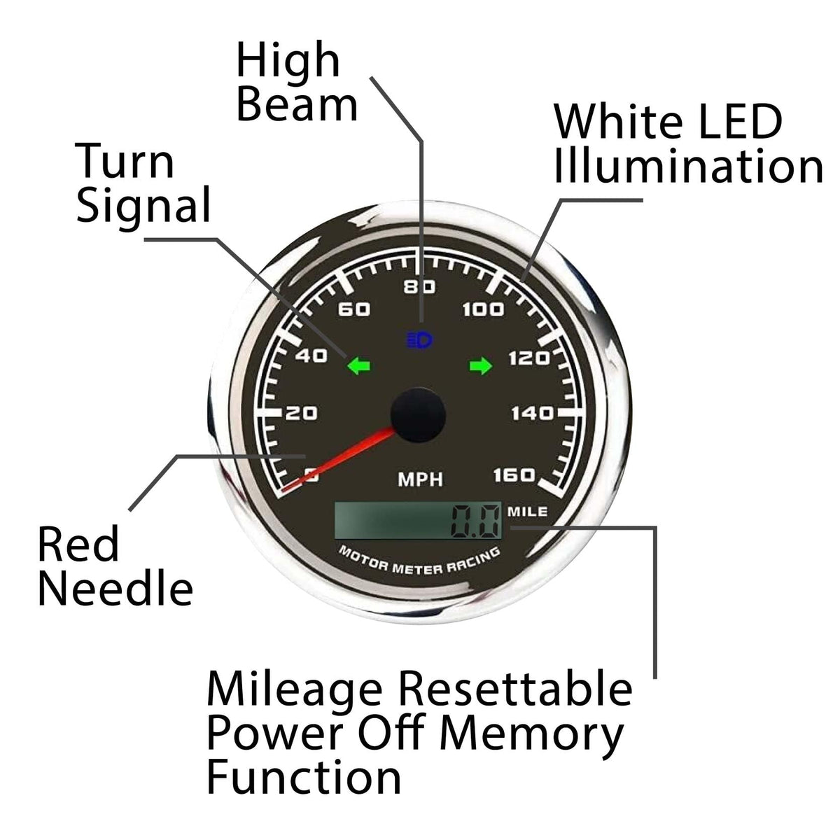 Motor Meter Racing W Pro 85Mm 3-3/8'' Gps Speedometer With Turn Signal High Beam 160 Mph Black Dial White Led Digital Odometer W