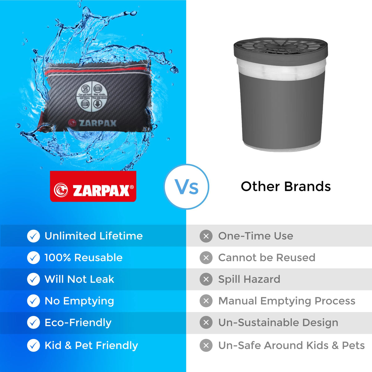 Q: Can I reuse the ZARPAX dehumidifier bags, and how do I reset them?A: Yes, the ZARPAX dehumidifier bags are reusable. To reset them, simply place the bags in the microwave for 2x6 minutes once the humidity indicator changes from blue to pink, indicating they have reached their absorption capacity.