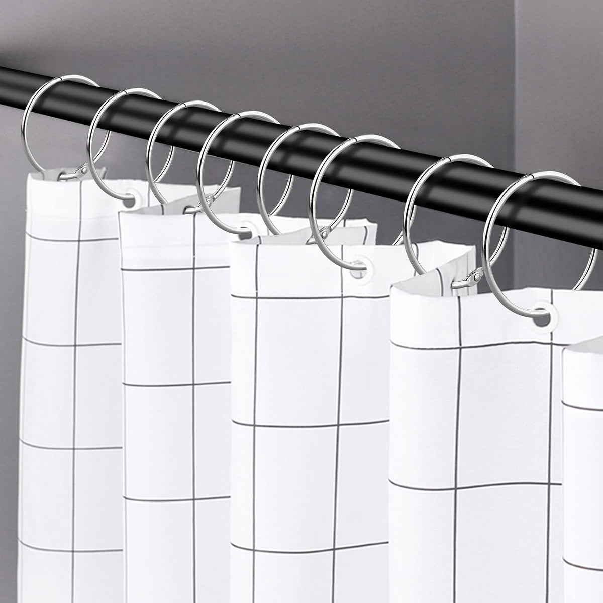Q: Are these shower curtain rings rustproof?A: Yes, these shower curtain rings are made from 100% metal and feature a highly rust-resistant design, ensuring they last longer even in humid bathroom environments.
