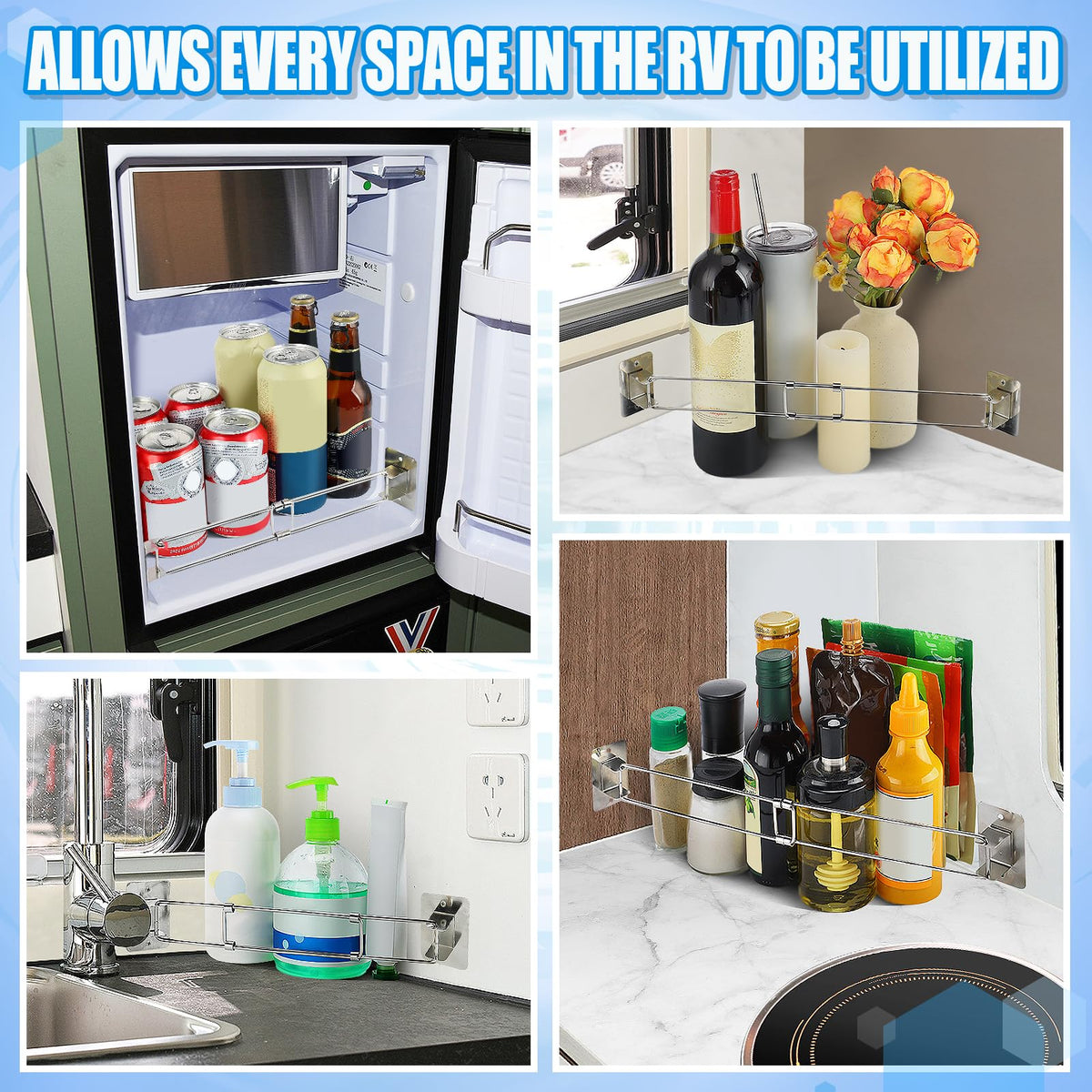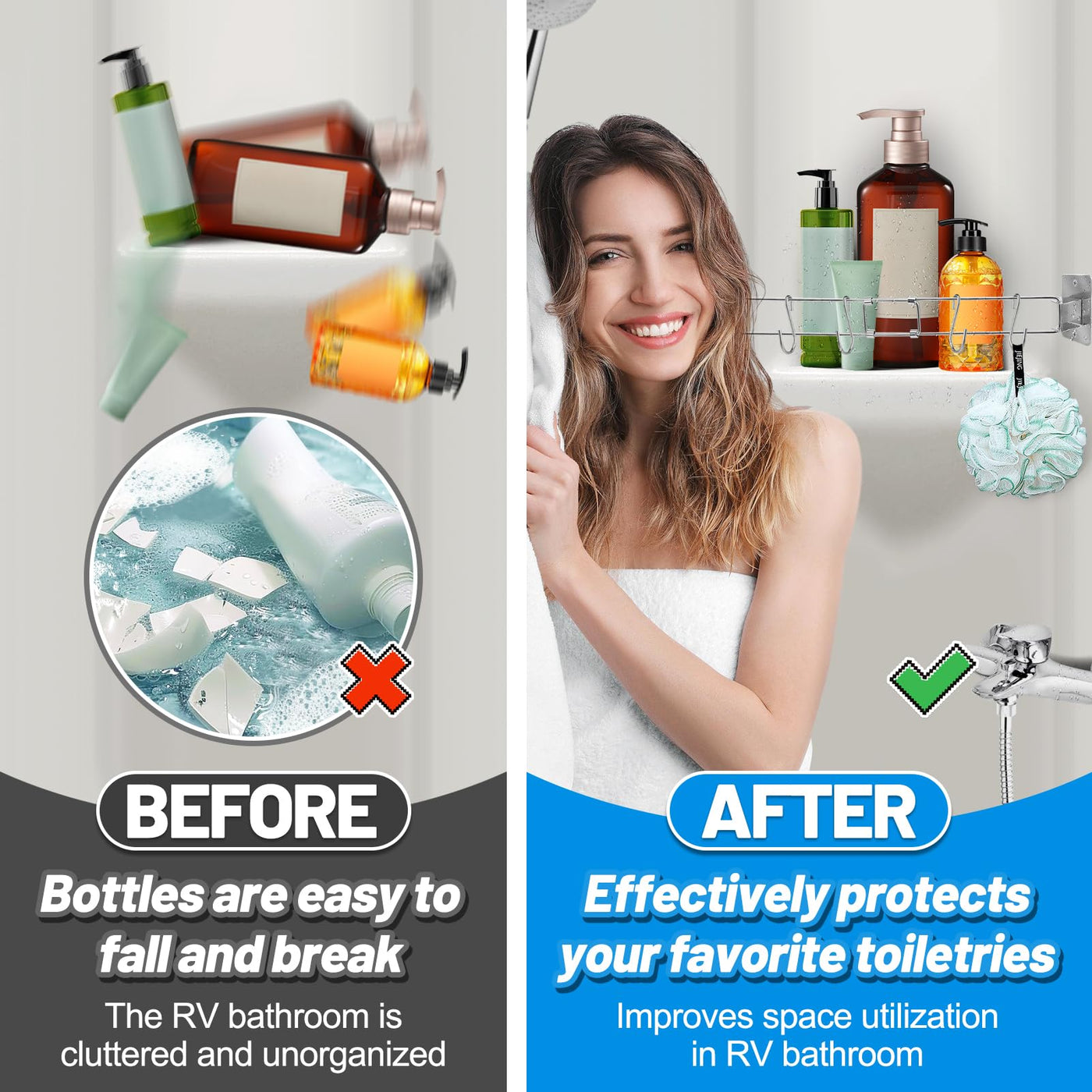 Keeping toiletries securely placed is critical when traveling in your RV. Our RV Shower Corner Storage Bar is the perfect solution. Its simple installation design ensures easy setup in your RV's shower space, effectively utilizing the corner area so your toiletries are always organized. Our storage rails are adjustable in length and angle to fit different sizes and shapes of RV bathrooms, providing more flexibility. Our products can easily cope with whether it's around a corner or under an irregular bathroom layout. The durability of stainless steel ensures long-term use and is suitable for shower areas in wet environments. The product includes small hooks for hanging bath sponges, towels, or other small items for more convenient use. 2 mounting options are available. Both can choose a double-sided adhesive stick, which is quick and easy and does not hurt the interior of the RV. It also comes with screws that can be punched for a more solid installation. Our products will become integral to your RV travel, bringing you a more convenient and comfortable travel experience. Product Information: Quantity: 2 Packs Material: Stainless Steel Length: 9 in~15 in S-Hooks * 8 Screws * 8 Self-adhesive sheets * 4