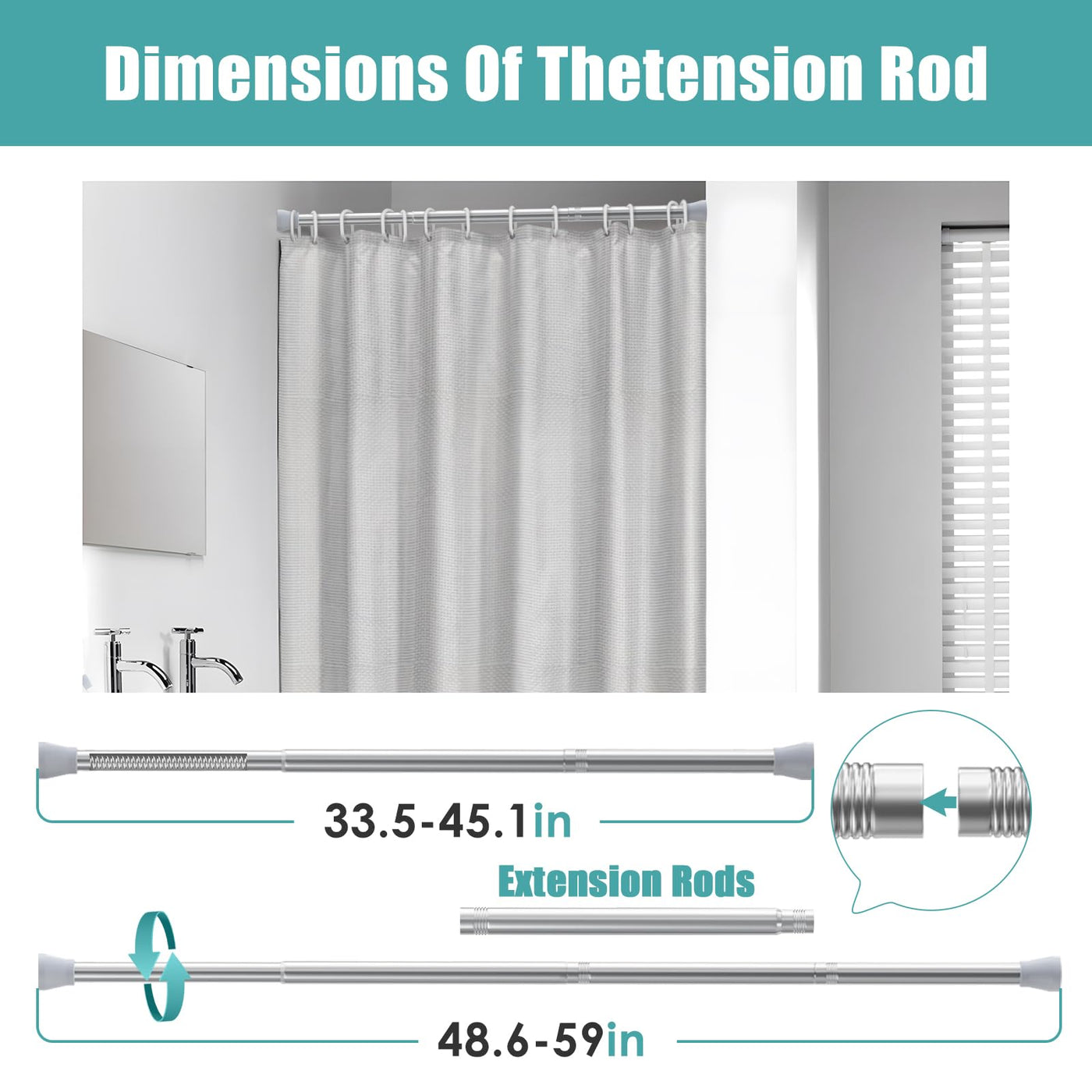 Aizesi Shower Curtain Rod Adjustable Curtain Rods 34-59 Inch Never Rust & Non-Slip Shower Rod Tension Curtain Rod Curtain Rods No Drilling Shower Rods For Bathroom Kitchen, Silver