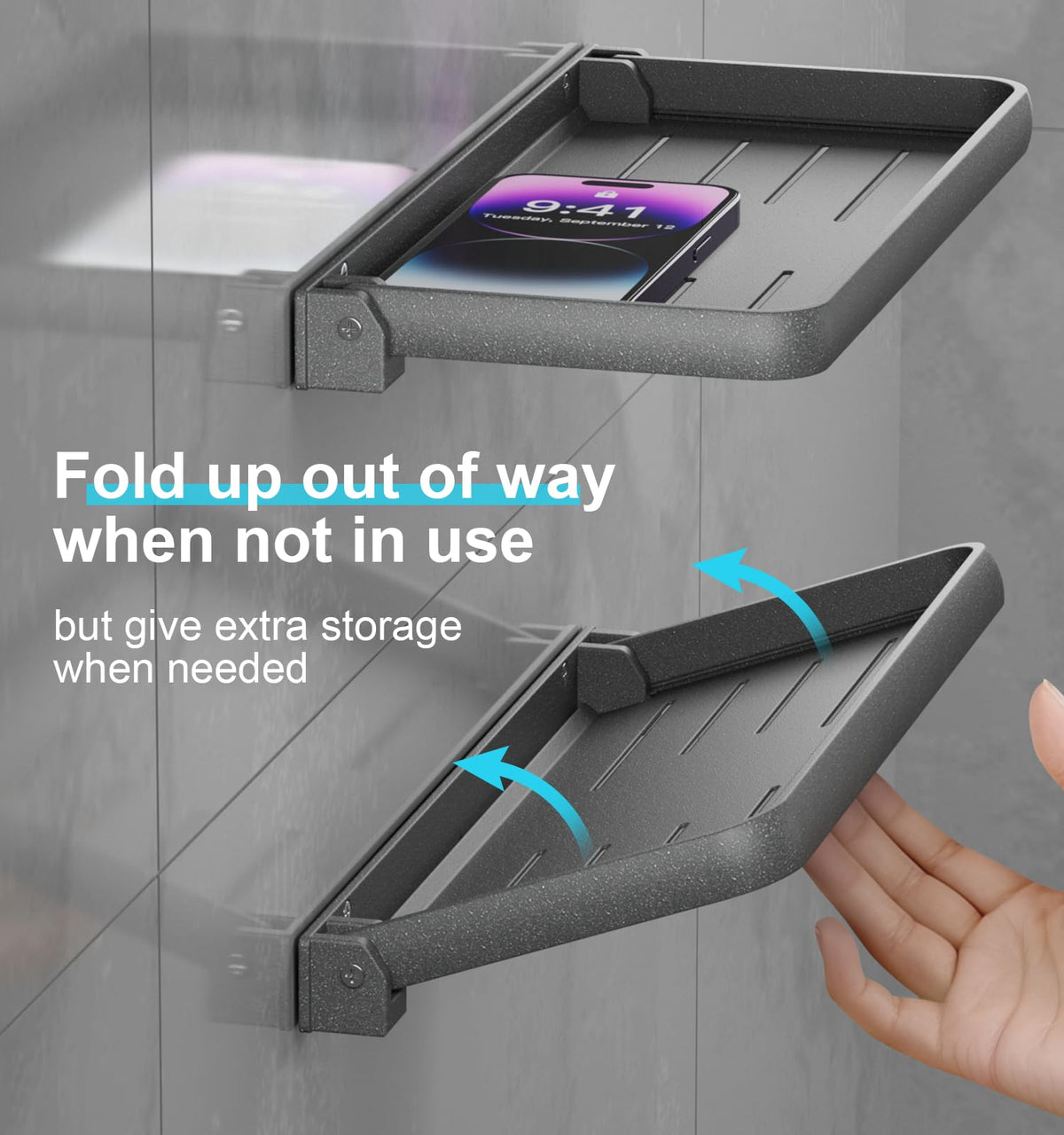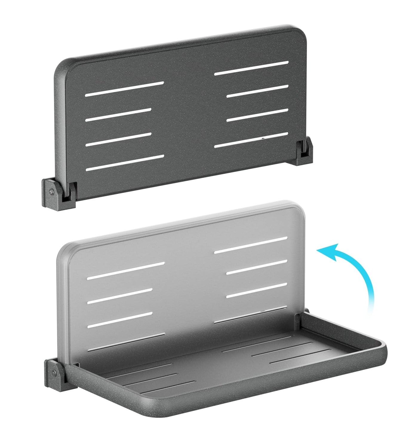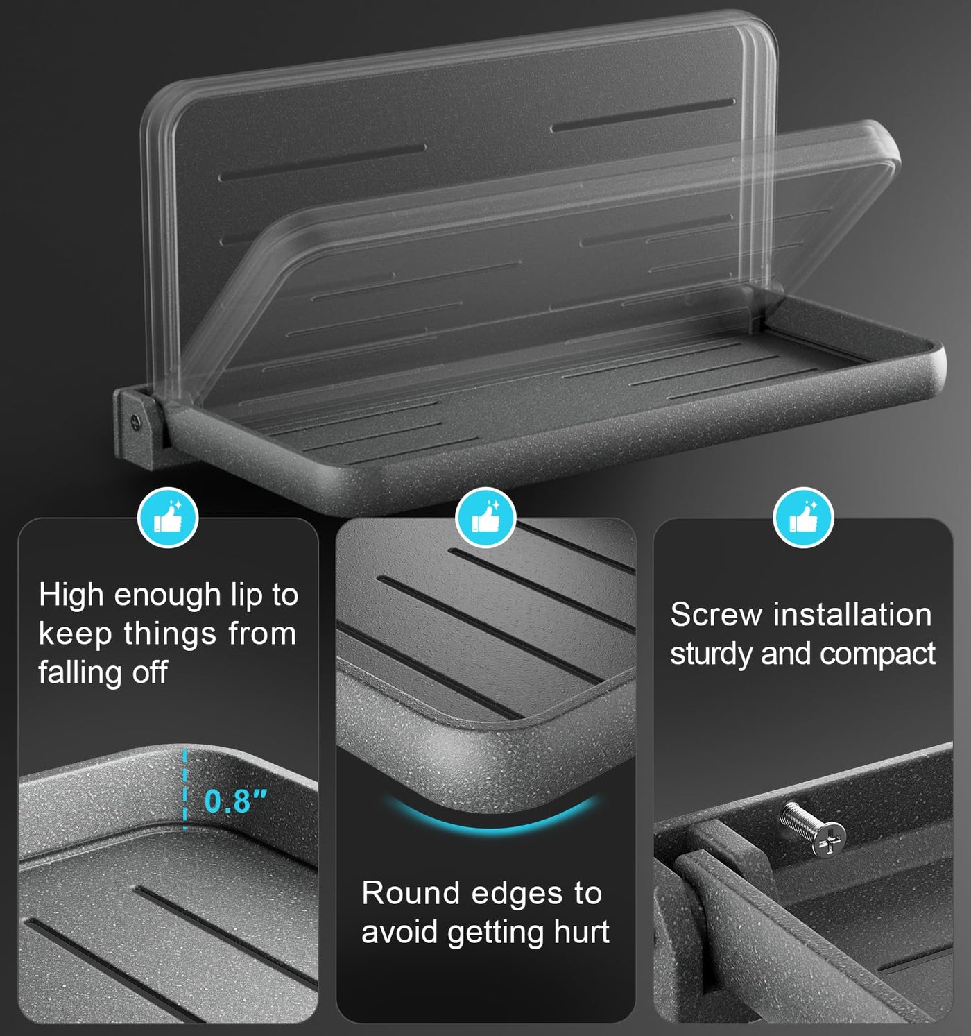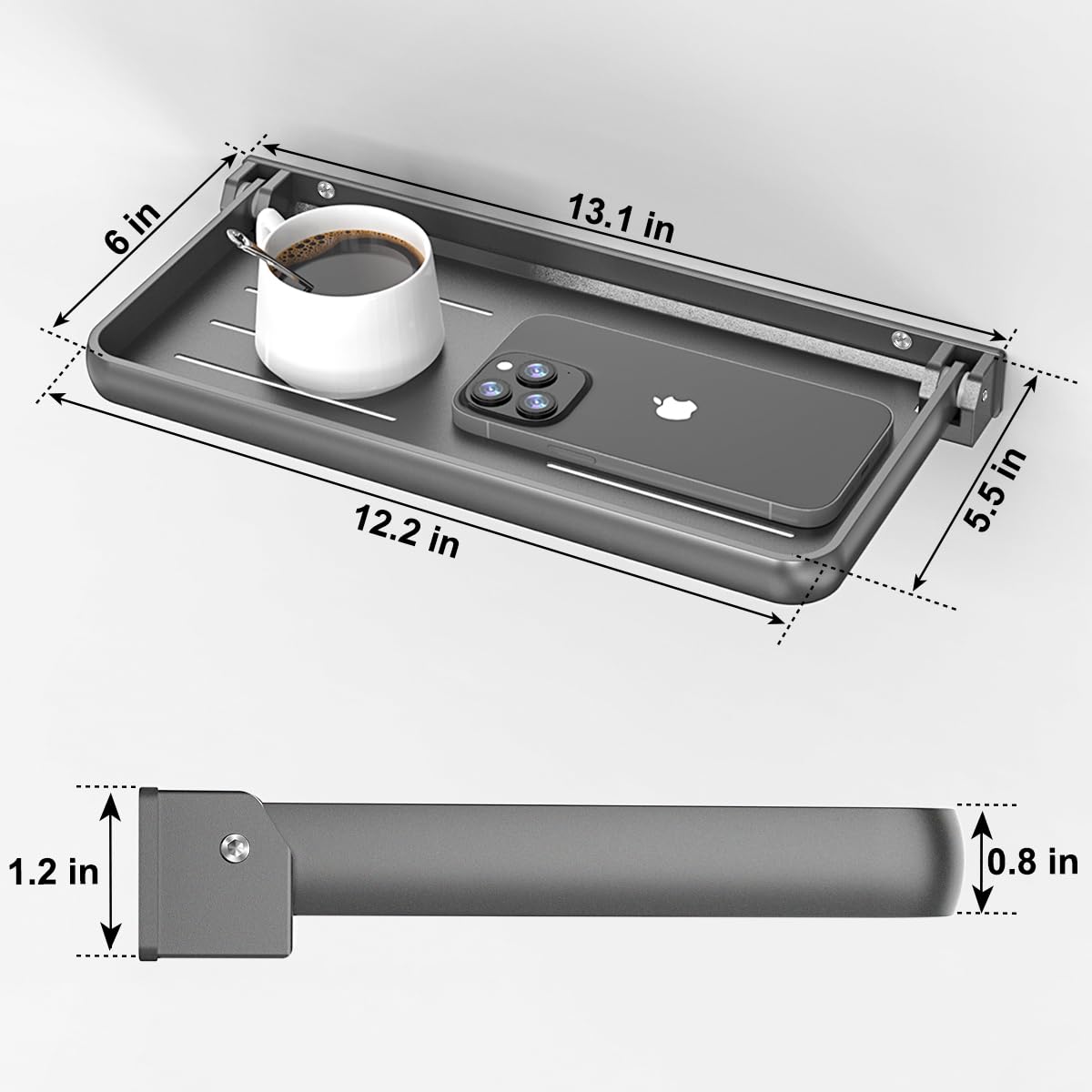 2 Pack WanDwel RV aluminum fold down wall shelving - camper essential accessory for inside storage and organization - Versatile Space Saving Floating Shelf Dimensions: 12.2 L x 4.8 W Weighht: 12 ounces Material: Aluminum RV shelving Fold Up RV Shelf: 90 degree foldable Main Features for the camper folding shelf: 1. Collapsible trailer shelf: Works like a charm for the wall, you can fit your smartphone, glasses and water on it at night, and fold it up out of your way when not use it at day. 2. Great space saving shelf for RV campers: The foldable shelf is versatile and could be used in all sorts of areas around RV trailers, including bedside, sofa side, cabinet, kitchen, RV shower, bedroom, bathroom and so on, simple but effective RV storage and organization furniture. 3. Easy to install: With all hardwares included, the camper shelf is very easy to install, only need to drill 3 holes for each. 4. Well made and durable aluminum: Premium aluminum with high enough lip struction ensure it works great in RV, things will not fall off. No sharp edge make it safe to use. 5. Smooth but stiff enough to keep the trailer shelf stay closed in a moving vehicle, don't worry that it will unfold itself on bumpy road. 6. No harm to your wall: compact and lightweight RV shelf will not pull it from the wall.