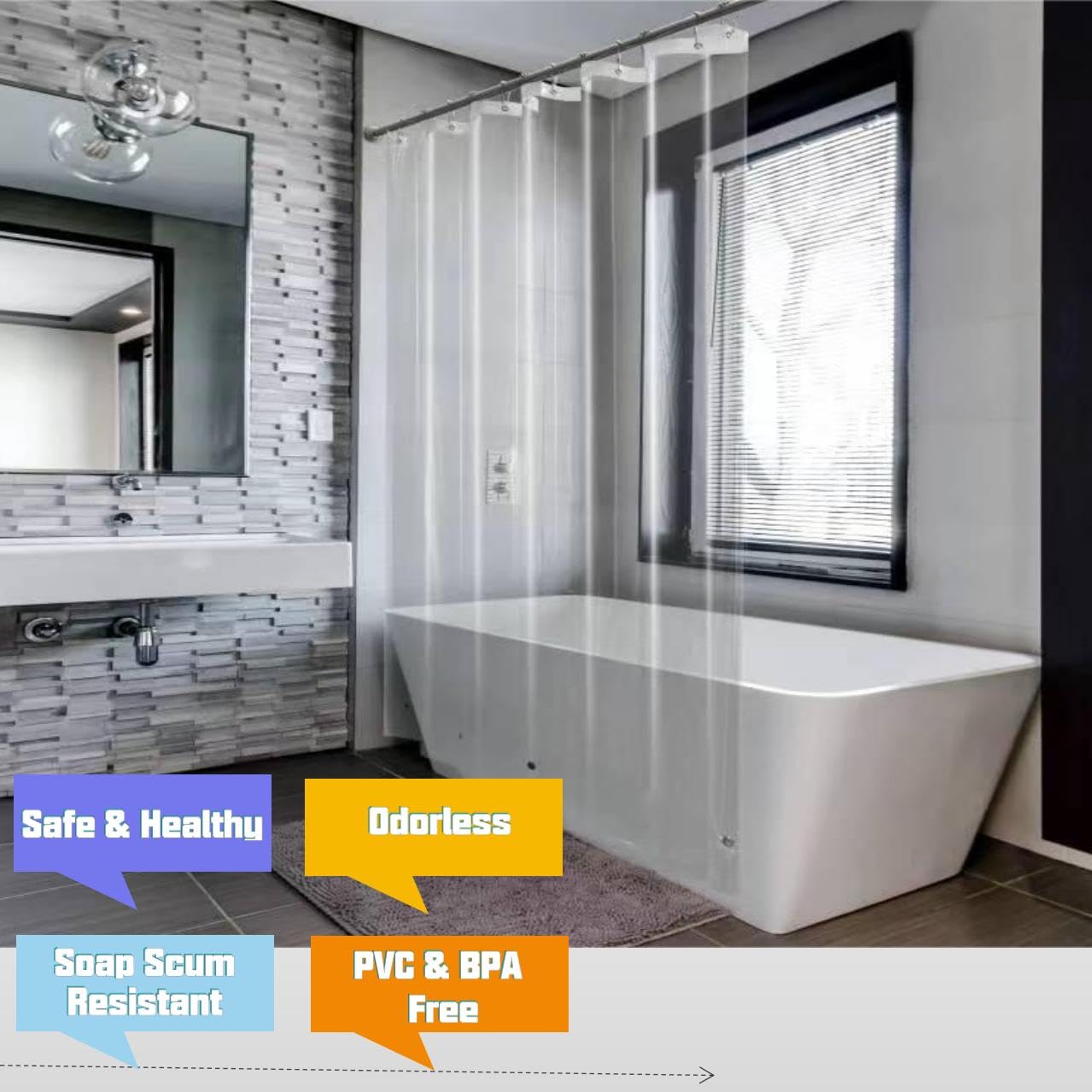 Q: Is the material of the shower curtain liner safe and eco-friendly?A: Yes, the Arayarser Shower Curtain Liner is made from premium PEVA material, which is non-toxic, PVC-free, chlorine-free, and odorless, ensuring a safe environment for your bathroom.