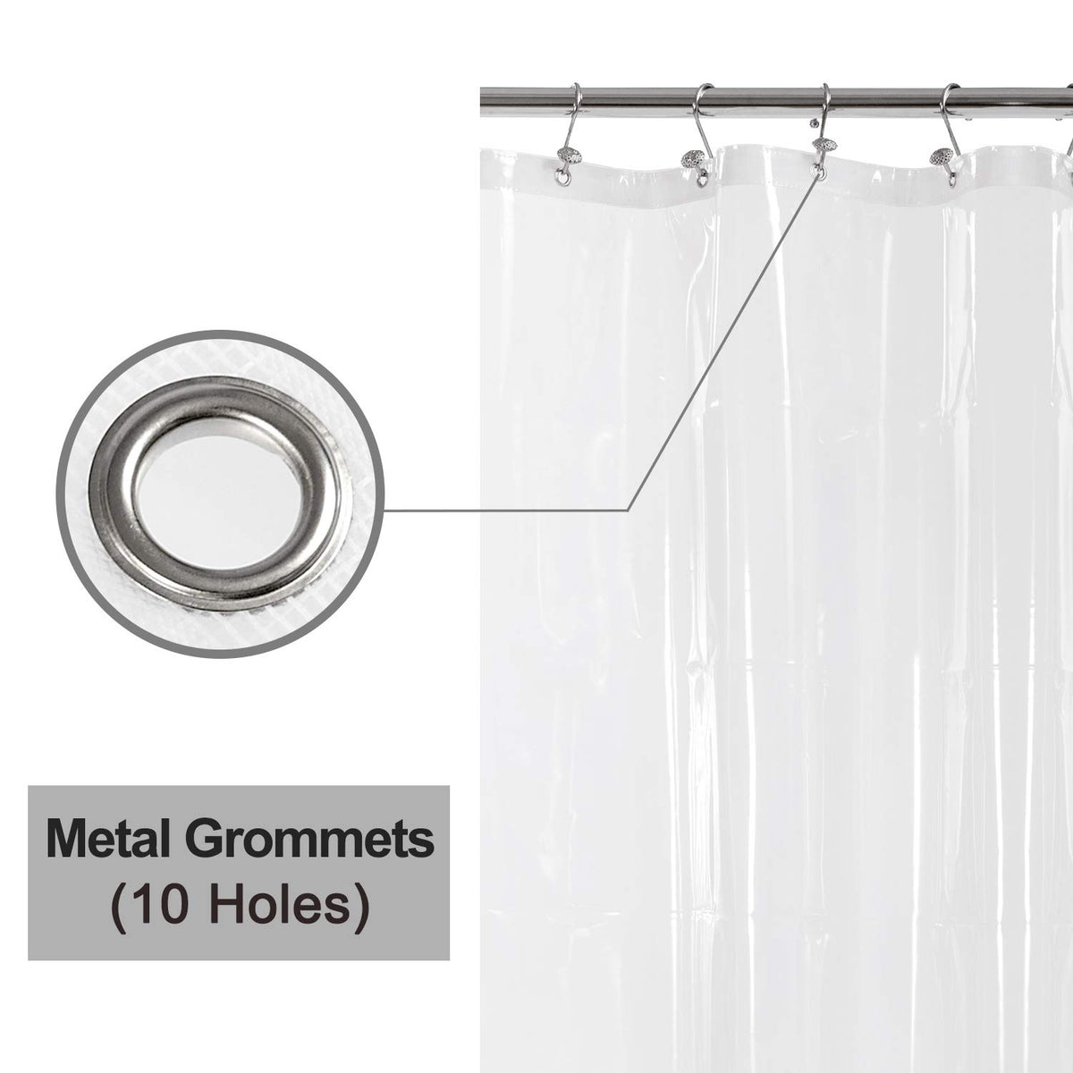 Reinforced Nylon Mesh Header with Metal Grommets, that will make this shower curtain liner easy to hang and smoothly to adjust.