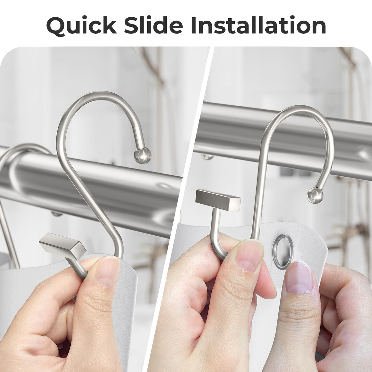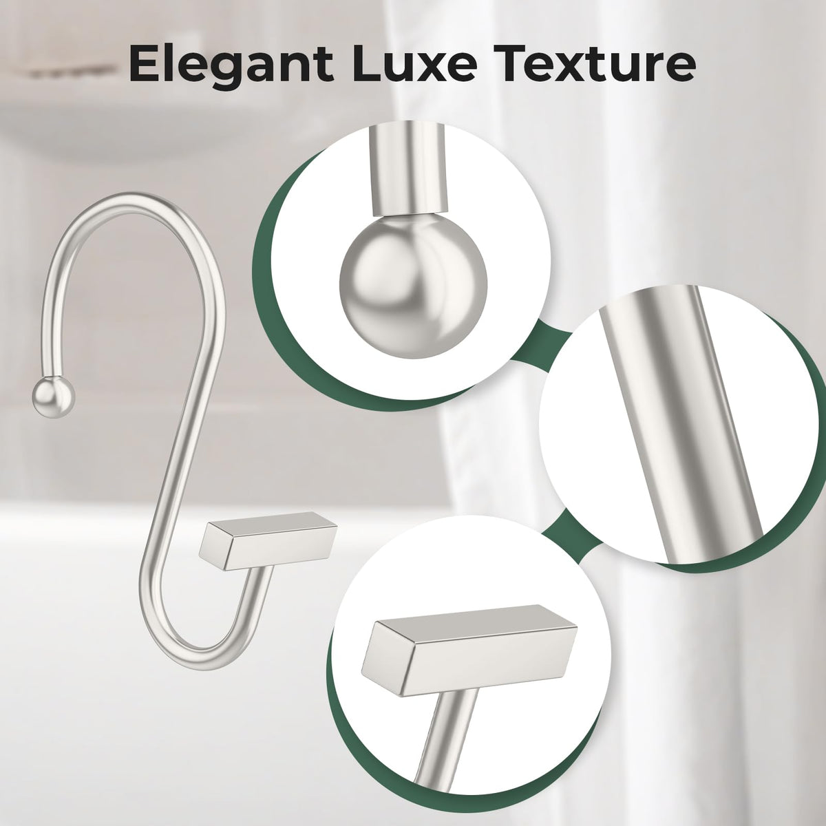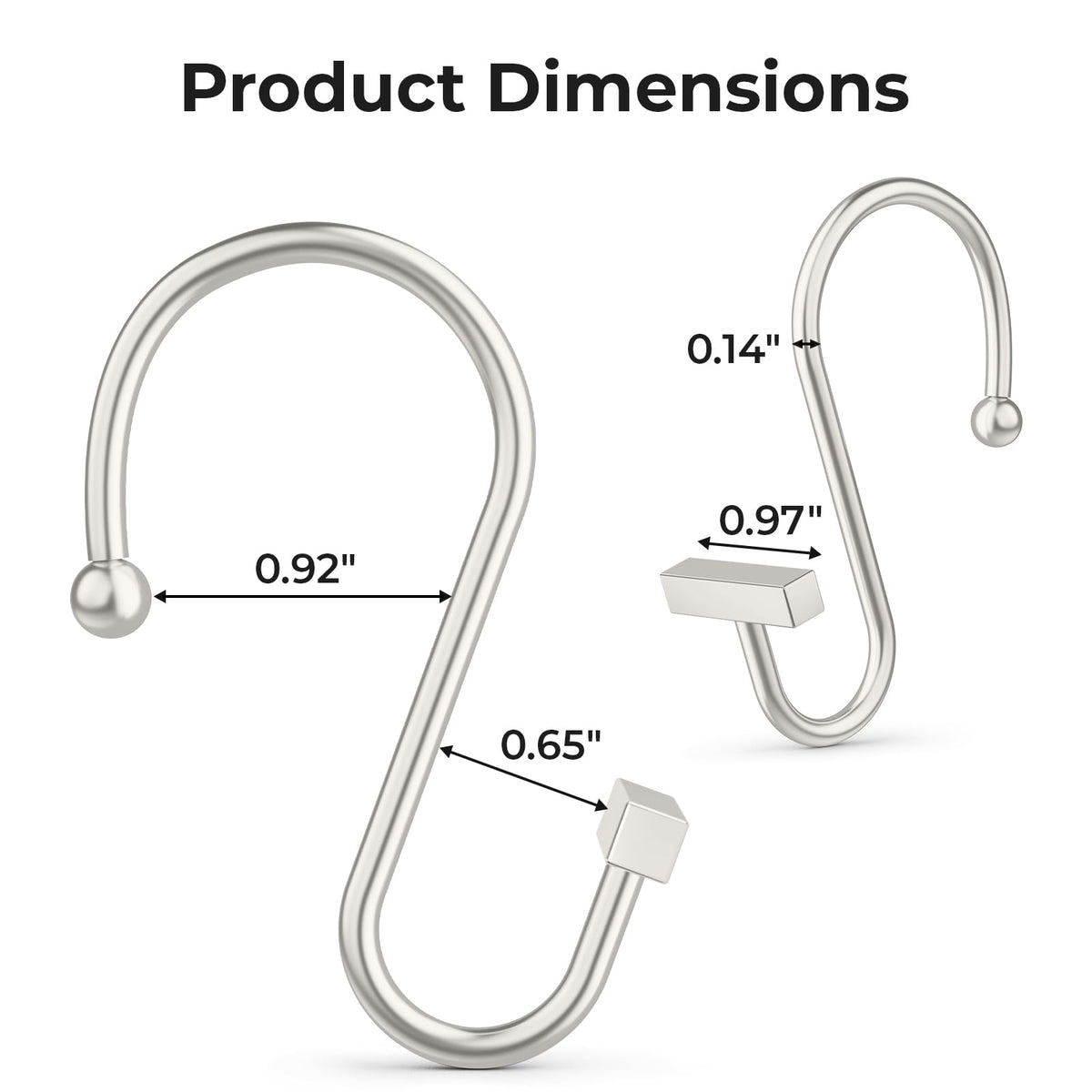 Bathway Square T-Bar S Shaped shower curtain hooks —a fusion of style and functionality for your bathroom. The unique design featuring clean-lined T-bars creates a modern, structured look, perfect for minimalist themes, adding sophistication to your space. Crafted from high-quality metal with an electroplated coating, these hooks offer prolonged durability by resisting rust and moisture, ensuring a pristine appearance and a longer lifespan. With tool-free installation, these hooks provide a secure fit, preventing slipping off the rod due to the ball head design and stopping the curtain from falling off the rings with the T-bar feature. Designed to hold up to 55 lbs, these sturdy hooks are perfect for heavy or double curtains, offering versatility beyond shower curtains. Explore their use in the bathroom, kitchen, bedroom, office, and garden for towels, pots, clothes, and more. These hooks are the ideal combination of elegance and reliability for all your hanging needs.