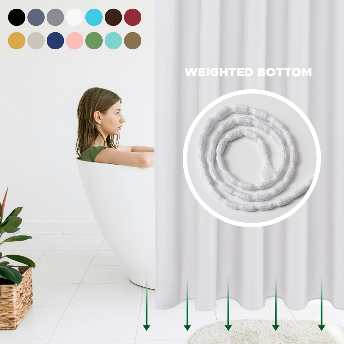Hotel quality polyester fabric, thick and reliability but soft in touch Fabric shower curtain liner is to assistant your qualified life in your bath, with this reliable, heavy but soft fabric which can repel water, it resists effectively keeping water inside the shower or bathtub. It can be used as a stand alone shower curtain or as a liner to coordinate with your decorative shower curtain. Rust Proof Copper Grommets construction and bottom with weighted band to keep hanging and standing.