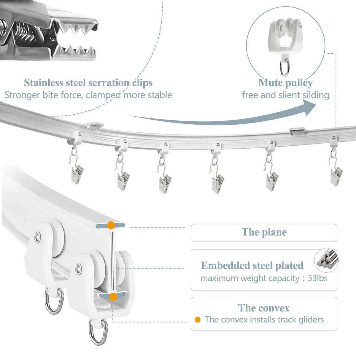 KOLAKO Ceiling Curtain Track, Bendable Curved Curtain Track Ceiling Mount Slide Rail Accessories Bunk Bed Curtains RV Curtain Track,Room Divider Ceiling Track for Curtanis You Will Get 1 x 3-meter flexible curtain track 24 x track rollers 9 x snap-on ceiling brackets 2 x end covers 18 Metal Screws + 18 Plastic Screws