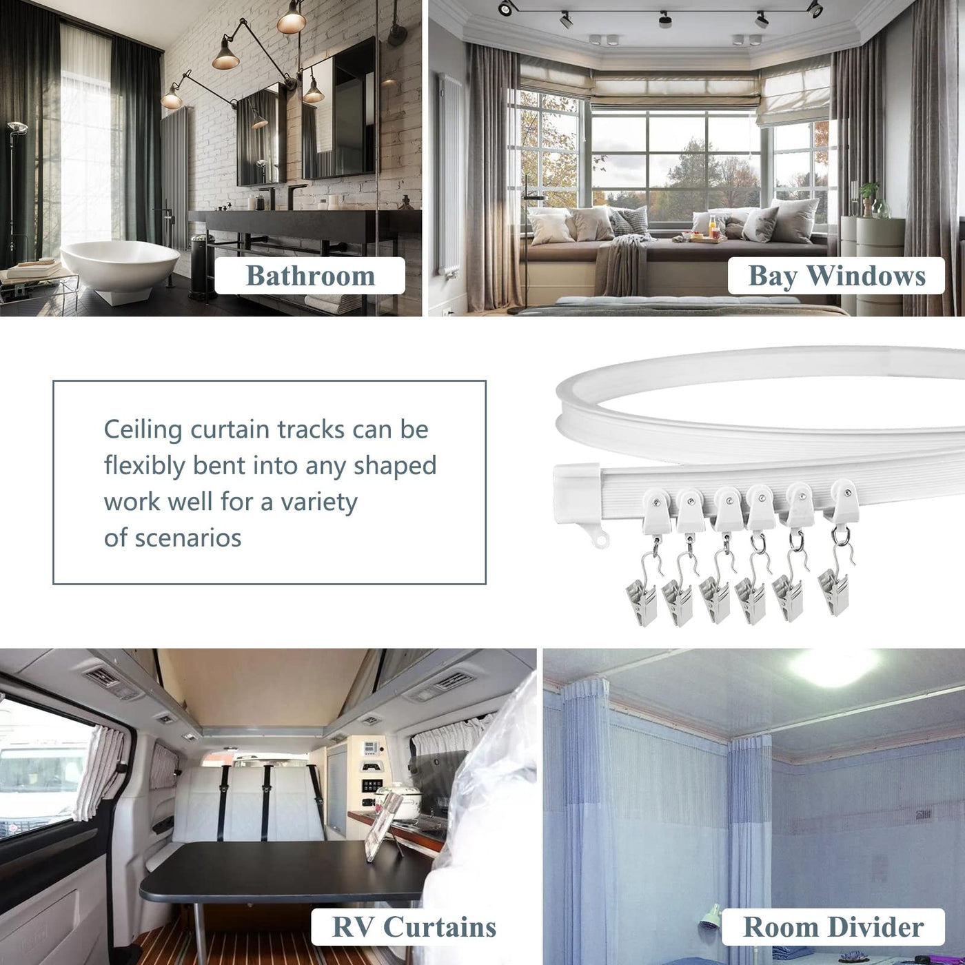 Q: Can this curtain track be used in a shower or RV?A: Yes, this flexible ceiling curtain track is versatile and can be used in multiple settings, including bathrooms for shower curtains and in RVs or trailers for space-saving room dividers.