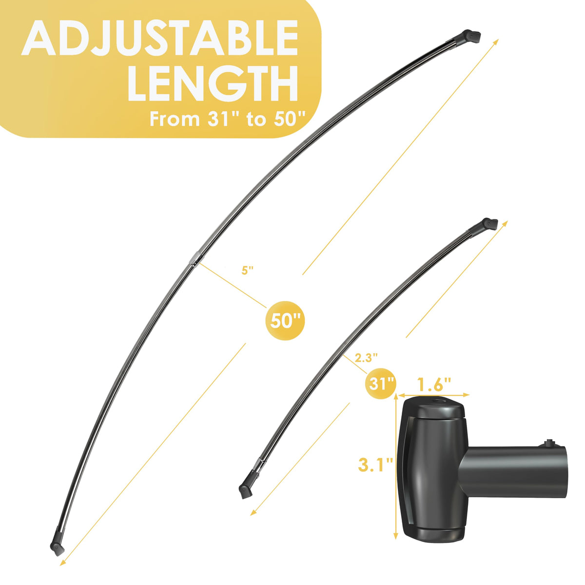 Q: What are the dimensions of the Chrsouly Adjustable Curved Shower Rod?A: The Chrsouly Adjustable Curved Shower Rod is designed to fit bathrooms with adjustable dimensions ranging from 31 to 50 inches.