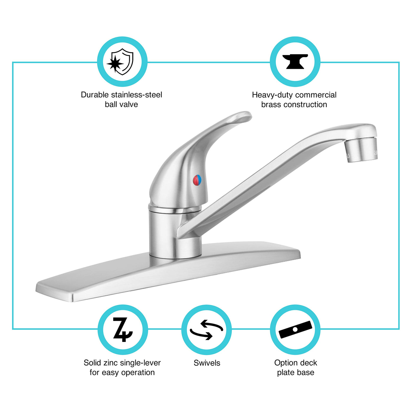 Q: What are the key features of the Dura Faucet DF-NMK600-SN RV Swivel Kitchen Sink Faucet?A: The Dura Faucet DF-NMK600-SN features a solid zinc single-lever control, a stainless steel ball valve for durability, and an aerated stream for splash-free washing. Its construction with commercial brass ensures stability during travel.