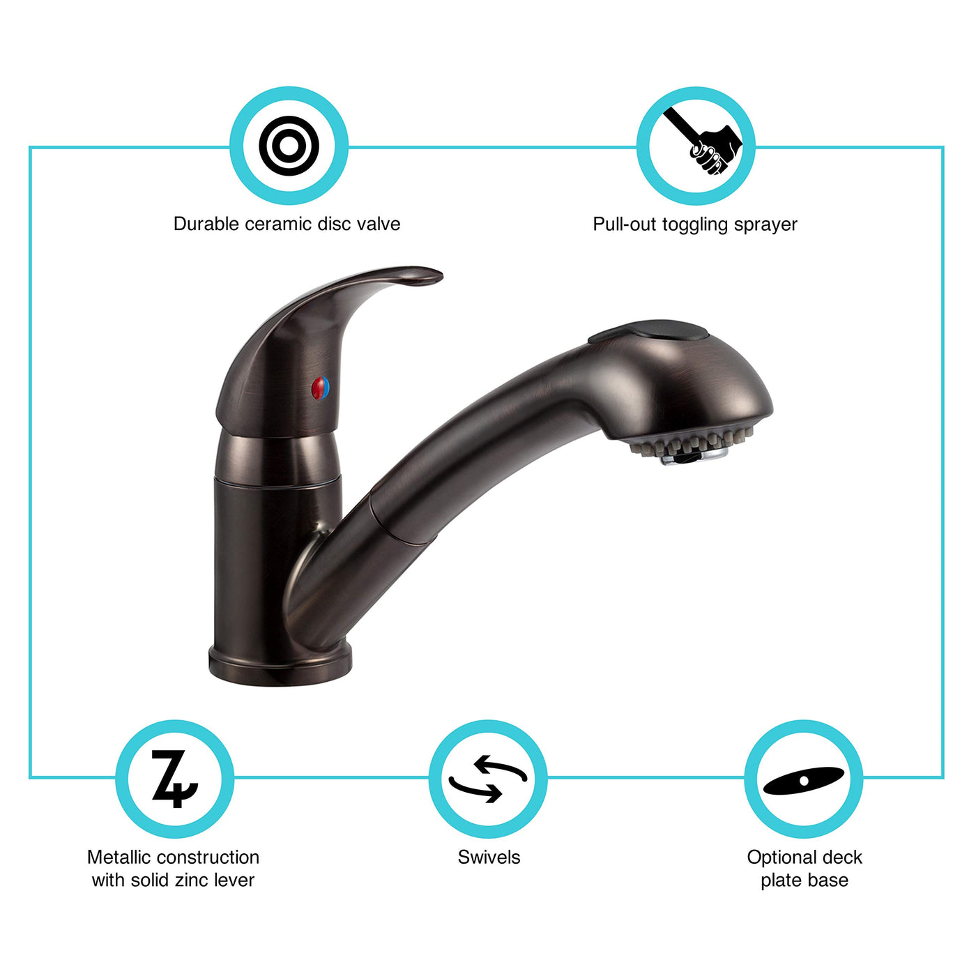 Q: What are the main features of the Dura Faucet DF-NMK852-VB?A: The Dura Faucet DF-NMK852-VB features a pull-out sprayer that toggles between stream and spray, a streamlined design for complete sink access, heavy-duty metal construction, a solid zinc lever handle, and a sturdy ceramic disc valve.