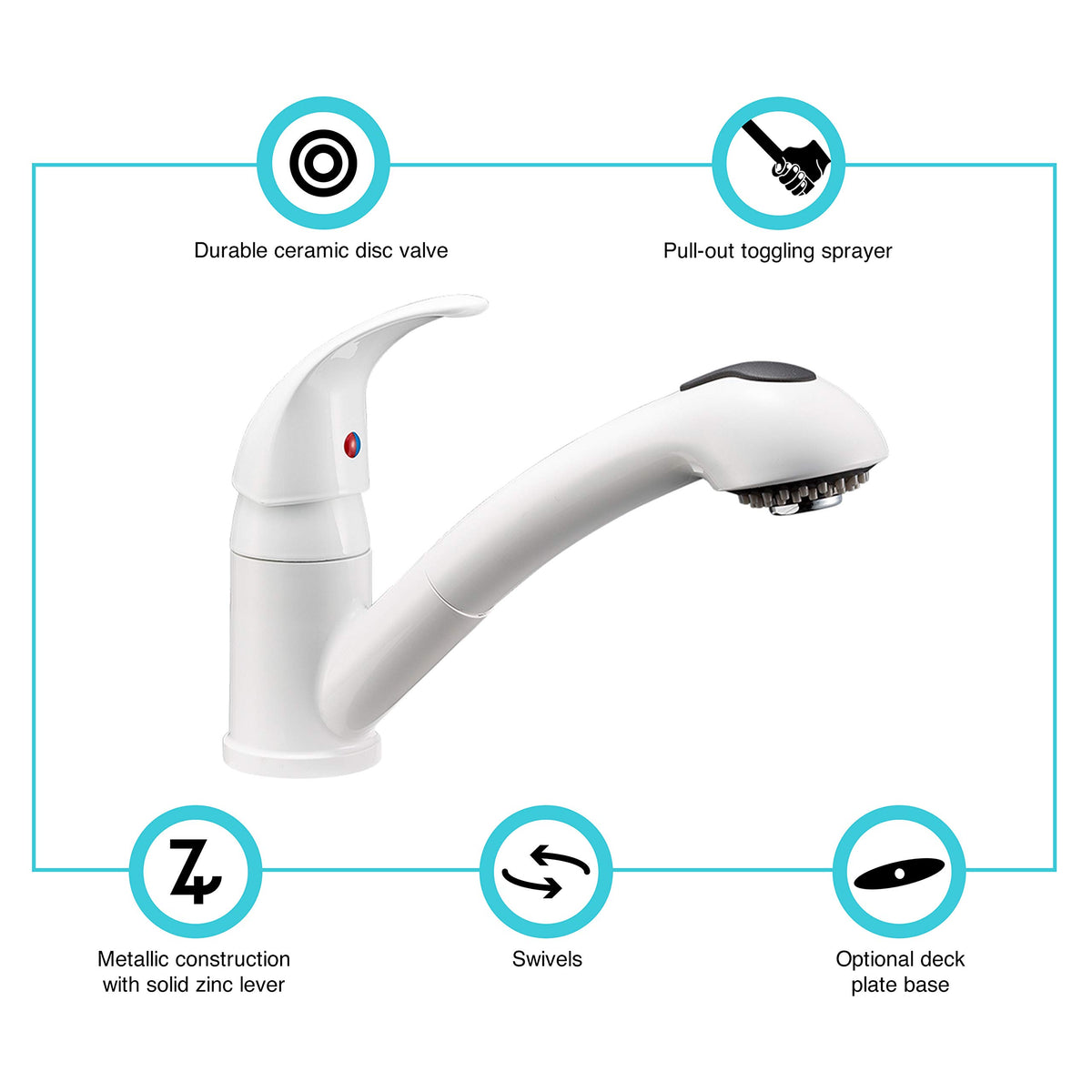 Q: What are the key features of the Dura Faucet DF-NMK852-WT?A: The Dura Faucet DF-NMK852-WT features a pull-out sprayer that allows you to toggle between stream and spray modes, providing versatility for various kitchen tasks. It has a streamlined design with heavy-duty metal construction, a solid zinc lever handle, and a durable ceramic disc valve for long-lasting performance.