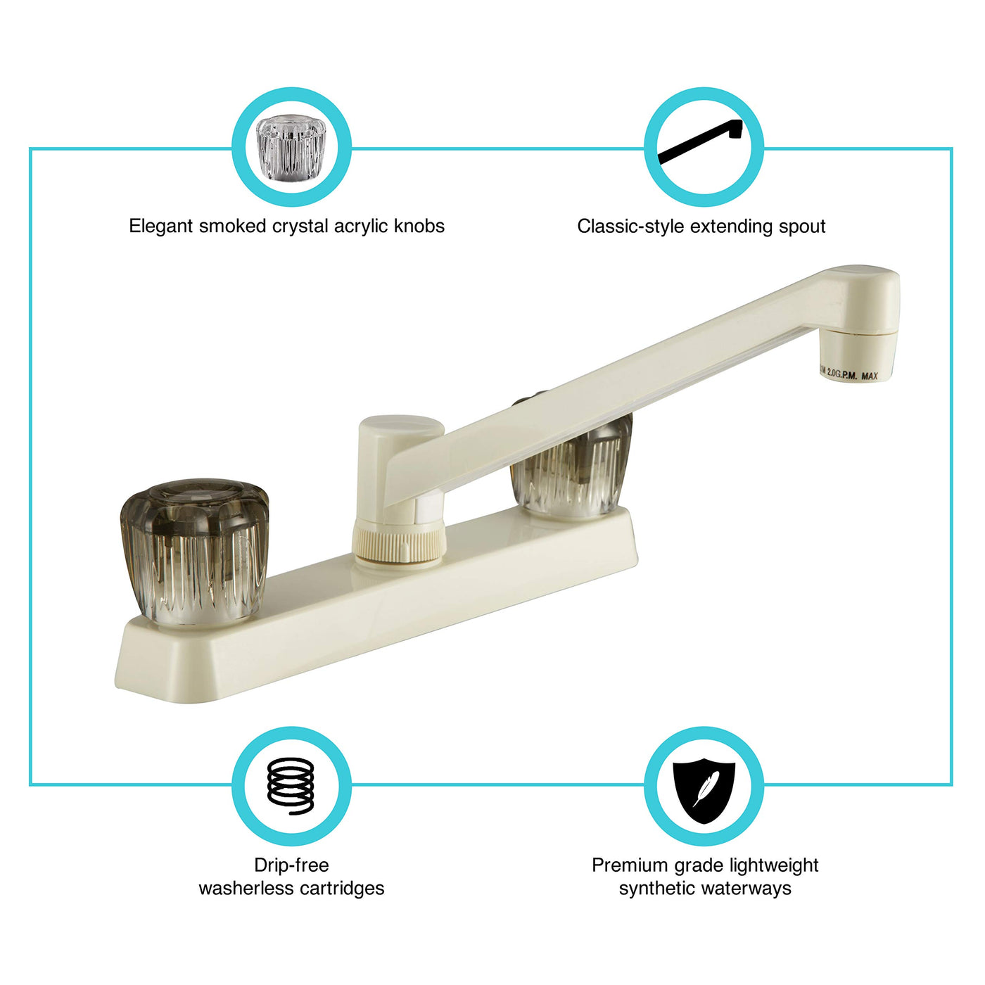 Q: What are the key features of the Dura Faucet DF-PK600S-BQ?A: The Dura Faucet DF-PK600S-BQ features smoked acrylic crystal knobs for easy temperature and water flow adjustments, a convenient far-reaching spout, drip-free washerless cartridges, and a lightweight synthetic construction with a durable brass spout.