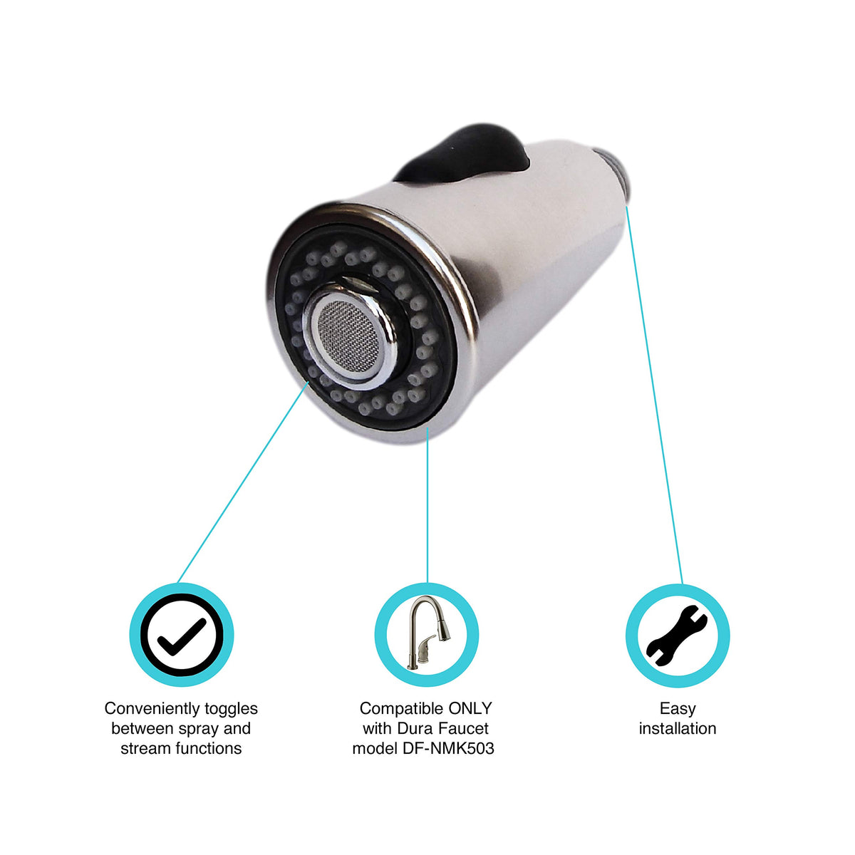 Q: What RV faucet models are compatible with this sprayer replacement?A: This replacement sprayer head is specifically designed for use with the Dura Faucet model DF-NMK503, ensuring a perfect fit and optimal performance.