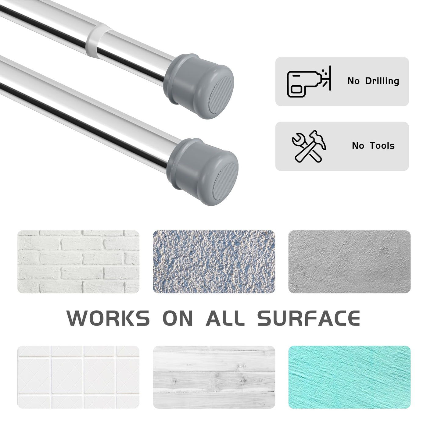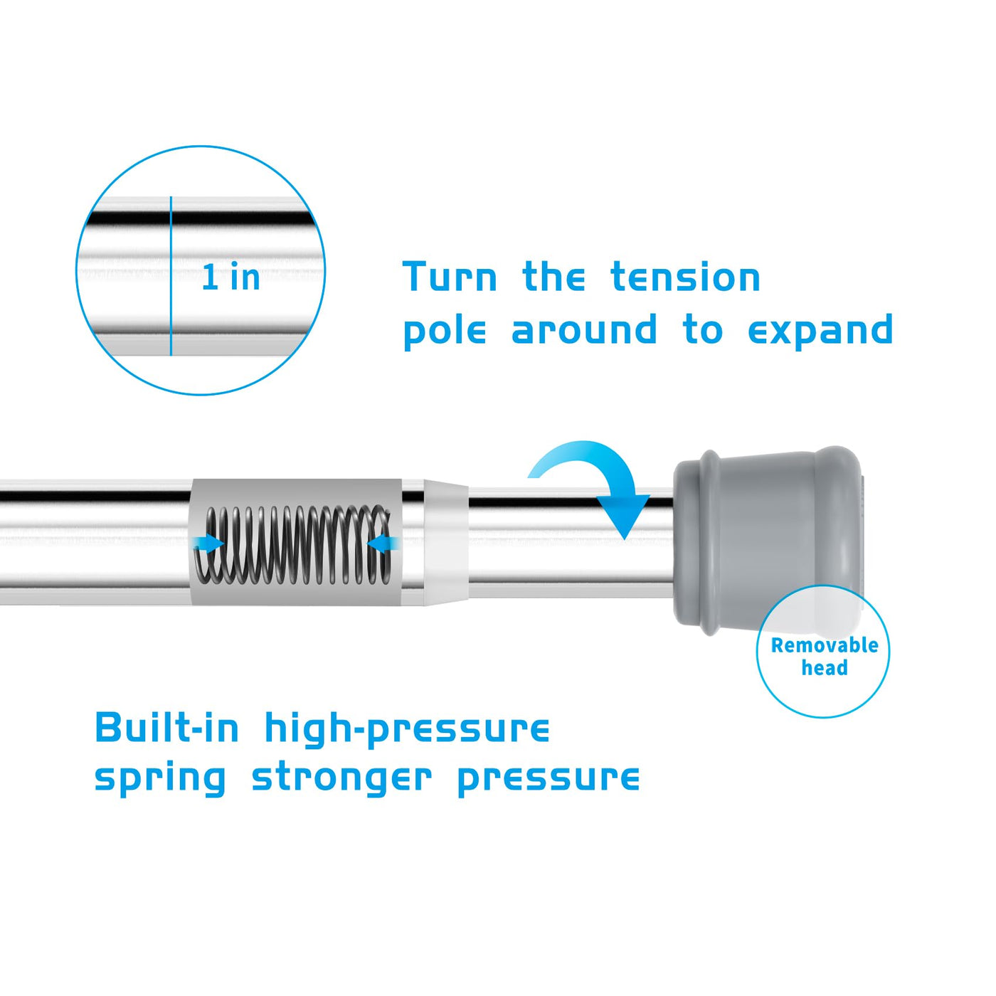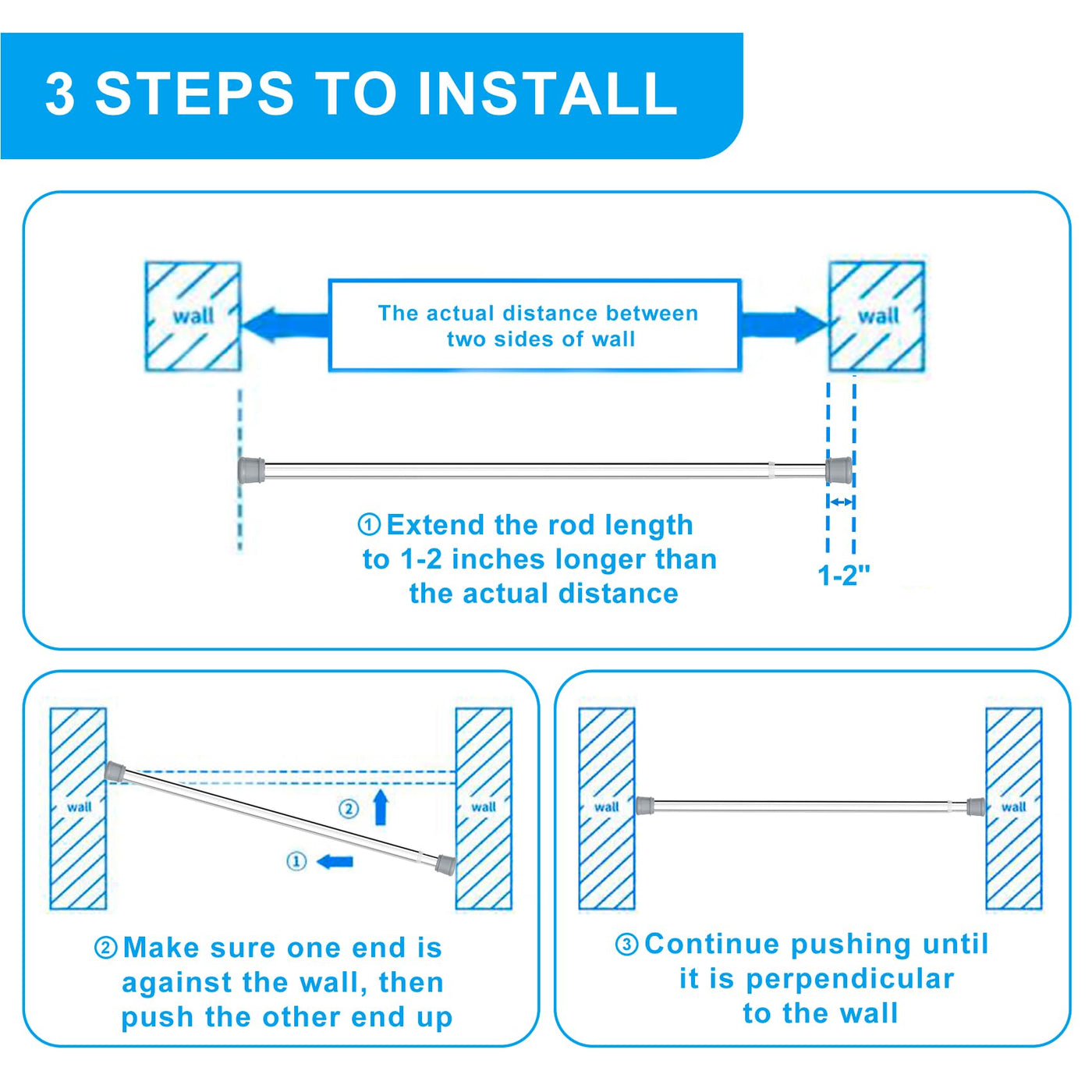 Suitable for both of smooth and rough surface like Wallpaper wall, Tile wall, wooden frame. Application: Functional spring tension rod is perfect for bathroom, shower stall, bathtub, changing area, closet, window opening, and more. Strong enough to hold shower curtains, window curtains, clothing, and other items. It can be used as curtain rods, shower curtain rods, room dividers, closet rods, etc.