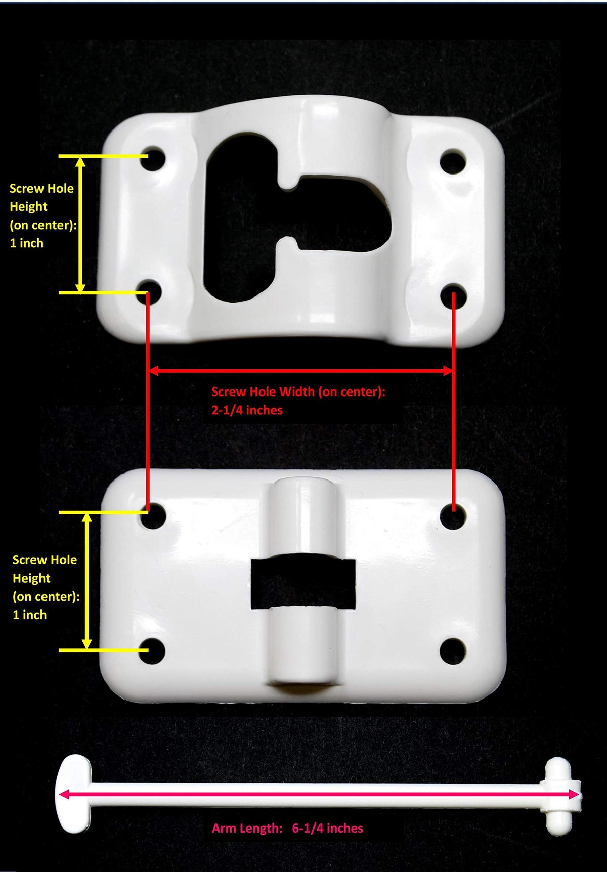 New 6” RV Entrance T-Style Door Catch Holder / Latch OEM quality aftermarket replacement part Heavy Duty, Durable Plastic T-Style Design – used by most RV company’s Prevent unwanted damage or injury from swinging doors Gives approximately 6” from door to wall when hooked Easy Installation – Mounting Screws NOT Included Exact items are pictured Color: White Available Pack Sizes: 1, 2, or 4 Pack Made in USA!