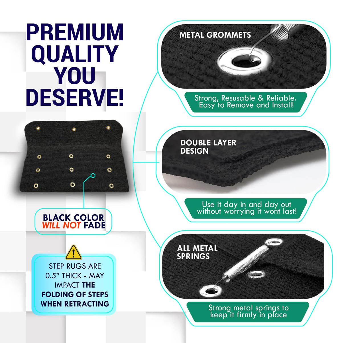 Q: What materials are used in LATCH.IT RV Step Covers?A: These RV Step Covers are made from double-layered polyester for enhanced durability, featuring all-metal grommets and springs for a long-lasting performance.