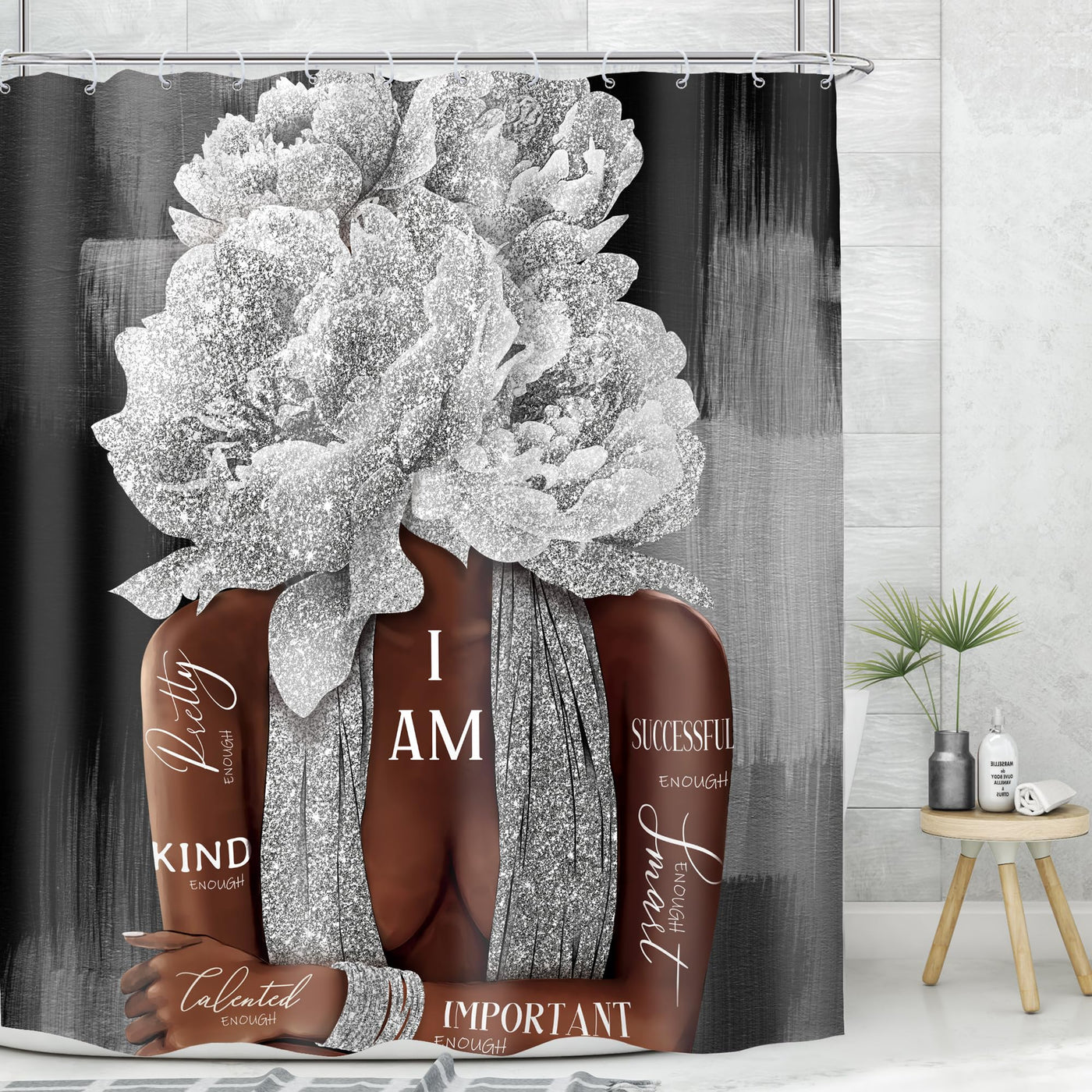 Meshelly Black Girl Shower Curtain 72Wx72H Gray Silver (Not Glitter) African American Peony Floral Bathroom Curtain Black Woman Quote Bath Curtain Cloth Fabric Bathroom Accessories Decor With 12 Hooks