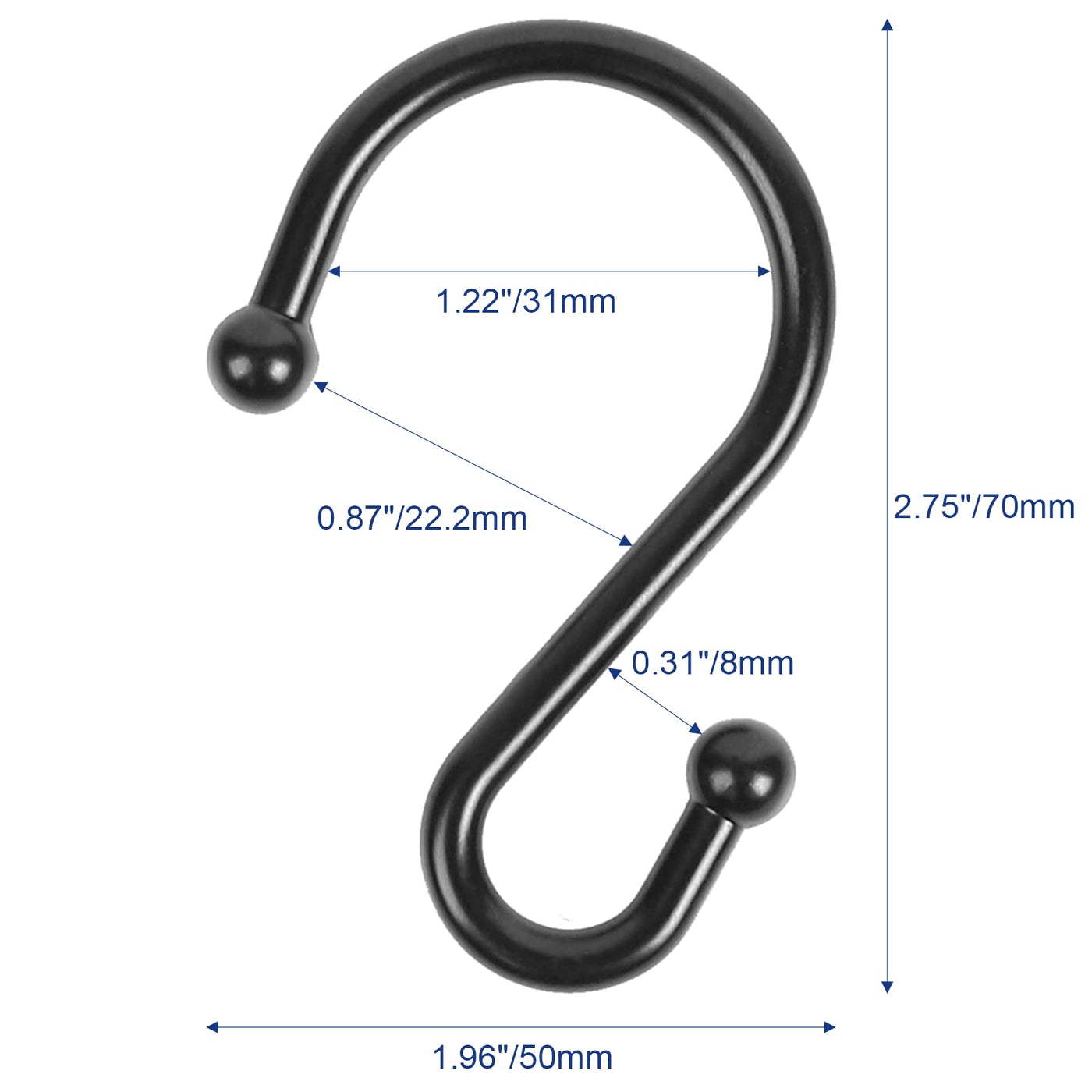 Q: What is the size of the Metal Shower Curtain Hooks?A: Each hook has dimensions of 1.61 inches in length and 1.61 inches in width, making them compatible with most standard size shower curtain rods.