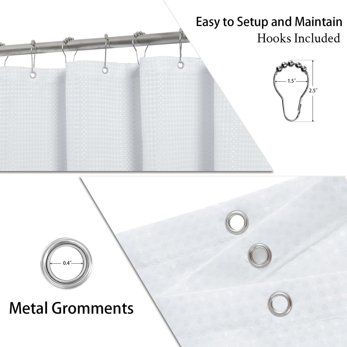 Q: Does the shower curtain come with hooks?A: Yes, the shower curtain comes with 12 rustproof metal hooks that are designed to fit most standard shower curtain rods.