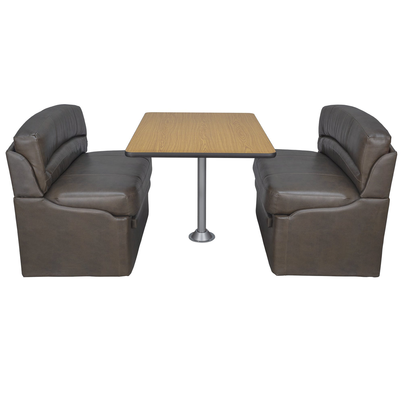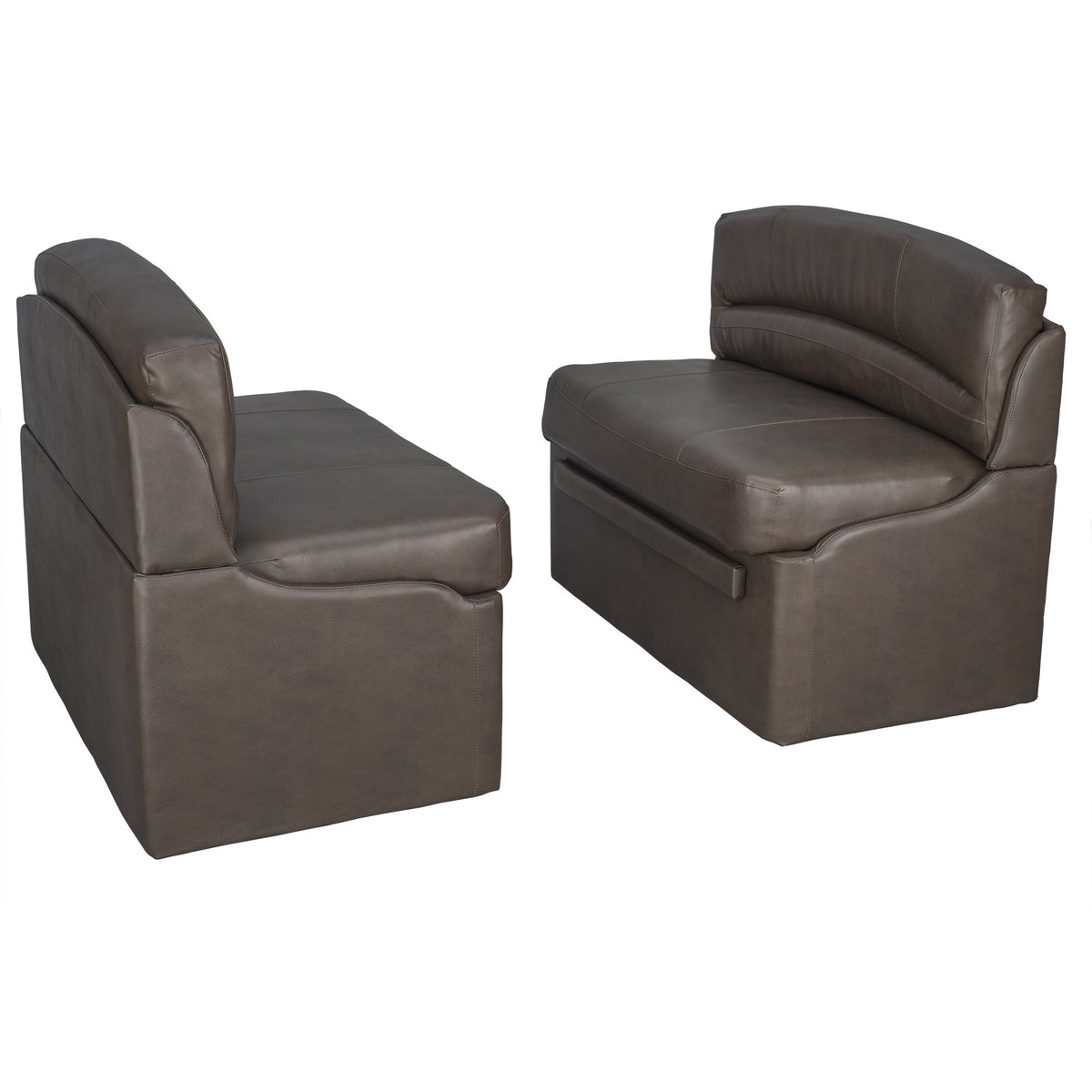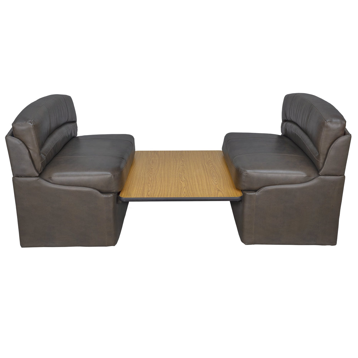 Booths: Features: Spacious storage under the benches Color: Oatmeal Quickly converts to a bed No bulky slide-out drawers Charles luxury line design and feel Optional RecPro color-matching thread available Comes in: 36. 38, 40, 42, and 44 Inner dimensions when bed is folded out: 74 Overall height (top of backrest: 31.5 Seat height: 18.5 Seat depth: 18 Sold as set or individually Weight of each 40 booth is 56 lbs. **ATTENTION** When installing the booth set with the RecLite table, make sure that the overall width of installation (measured from the backside of each booth) is 74 1/2. Each booth is 22 wide, and the tables (regardless of length) are 30 wide. This equals an overall measurement of 74. The extra 1/2 is so the table edges will not catch on the material and fit comfortably in the open space between the booths.