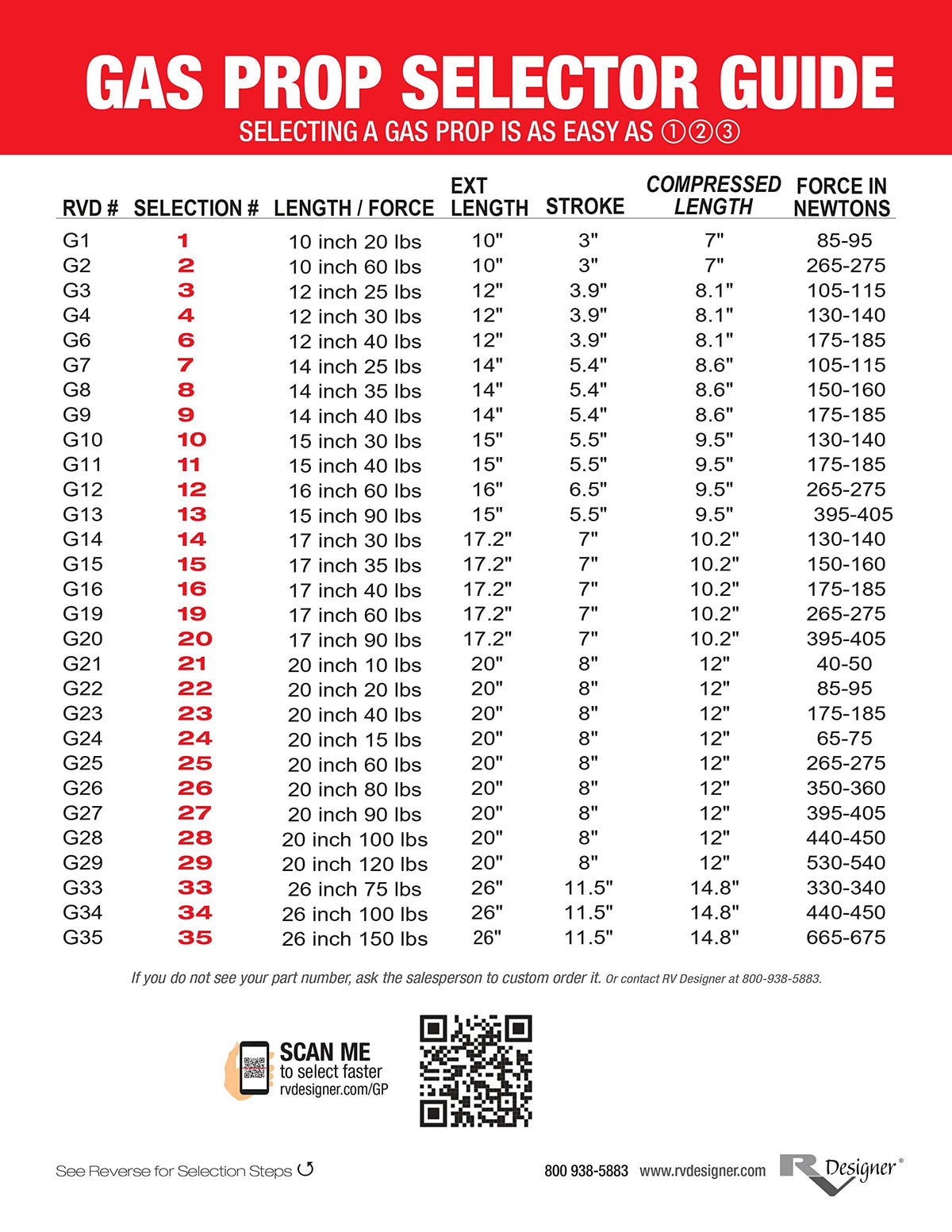 Q: Can I replace my existing gas prop with the RV Designer G29?A: Yes, you can replace your existing gas prop with the RV Designer G29 by matching its length and force as closely as possible. If your setup has two props, it is recommended to replace both for balanced door operation.