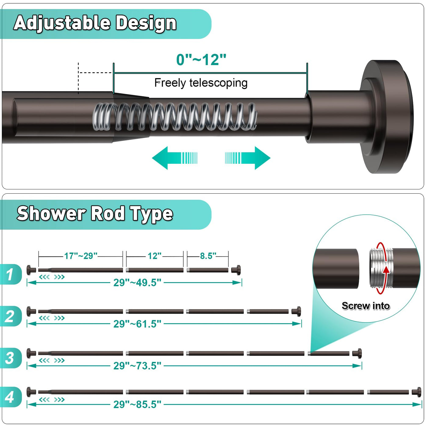 PrettyHomeTension Shower Curtain Rod: Our Tension Curtain Rods Come in Different Colors: Black,Bronze,Chrome,Nickel. Adjustable Size 29-49.5 inches, 29-61.5 inches, 61-73.5 inches,75-85.5 inches.