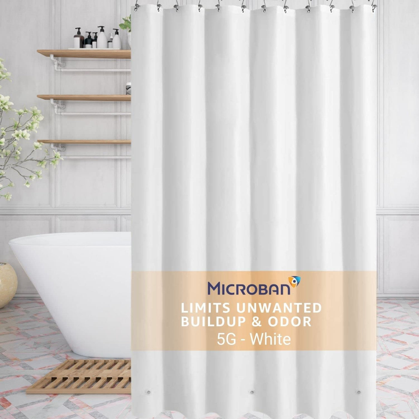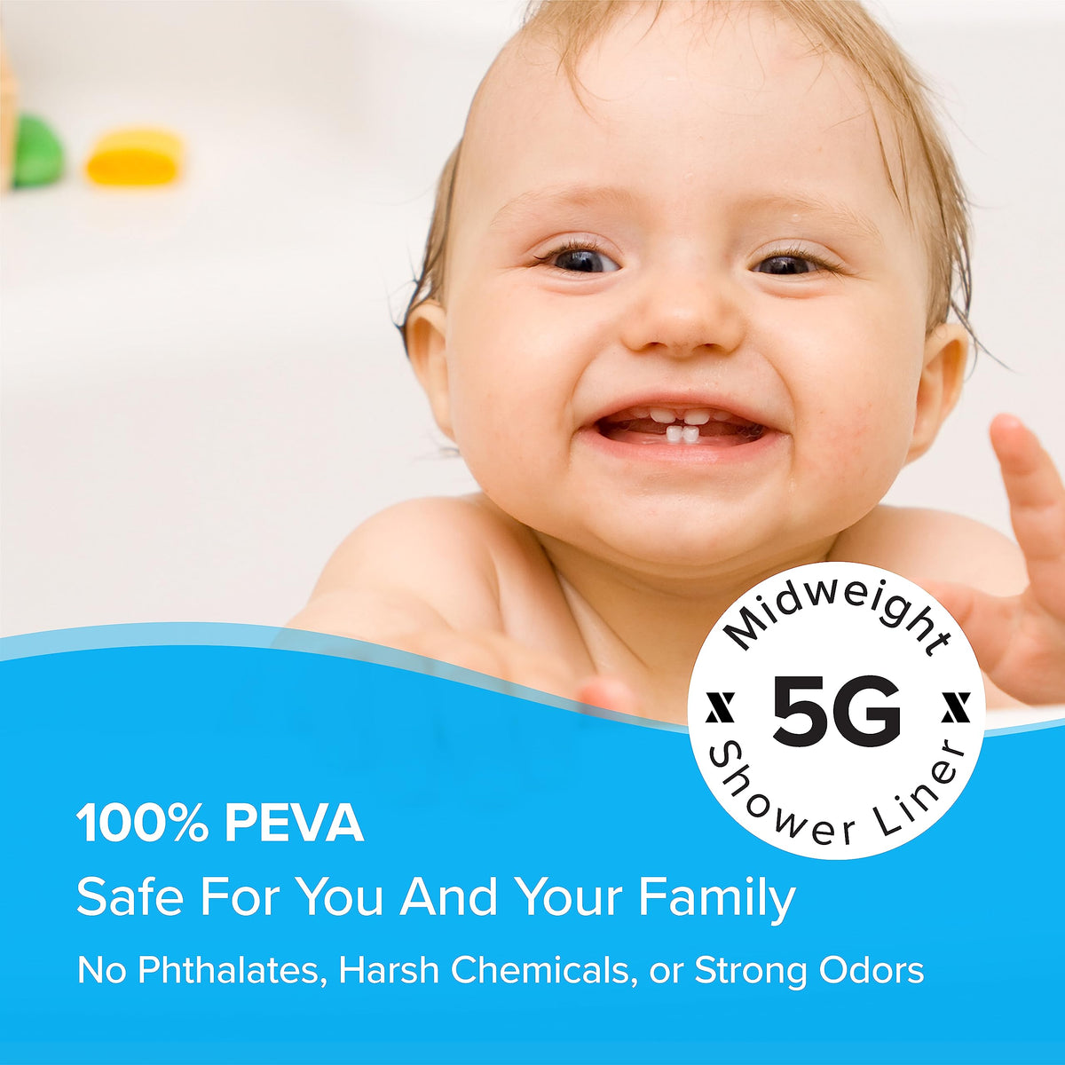 Q: What materials is the SlipX Solutions shower curtain liner made of?A: The SlipX Solutions shower curtain liner is made from 100% PEVA, which is PVC-free, phthalate-free, and free from harsh chemicals and odors, ensuring a safe environment for you and your family.