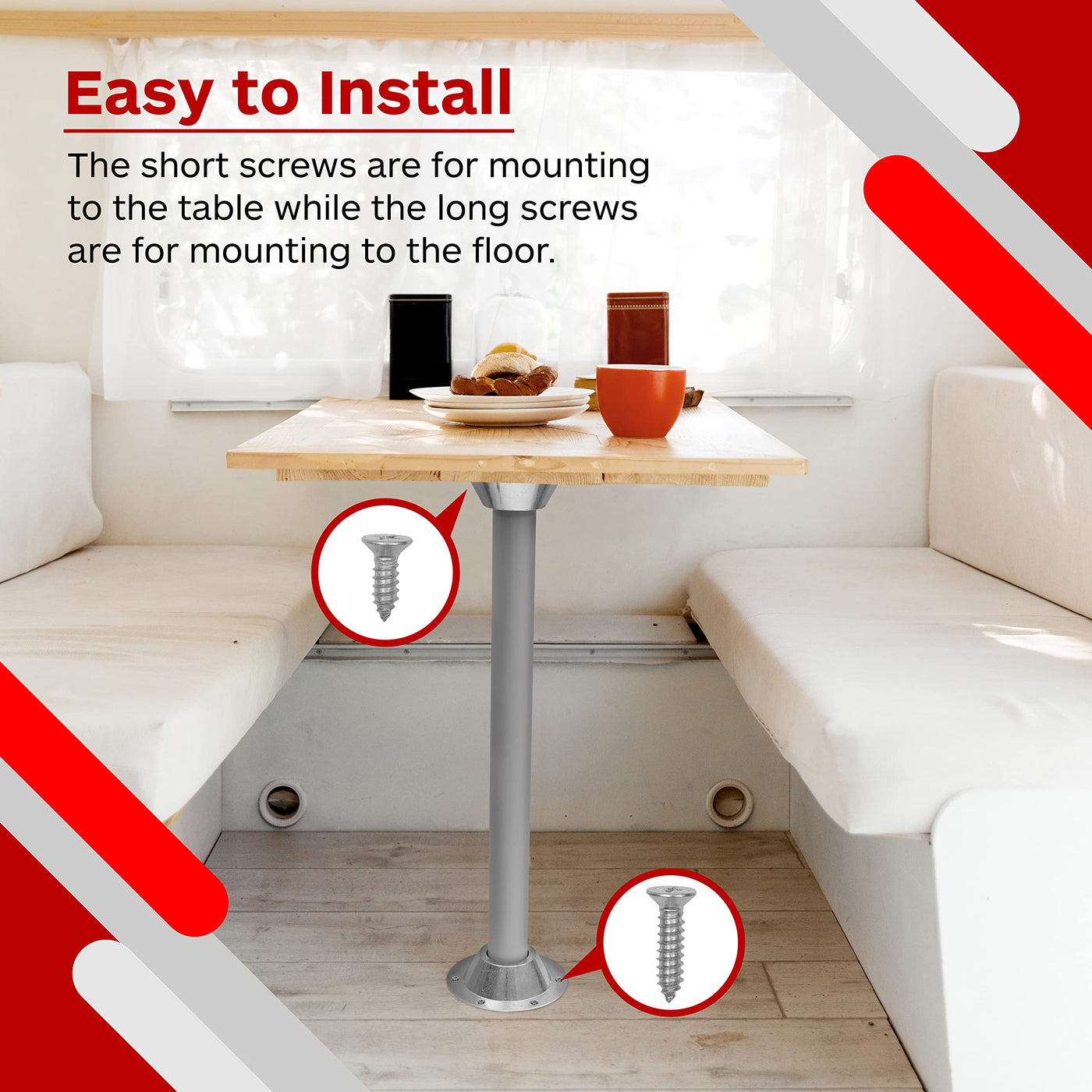 Q: Are the TonGass table bases easy to install?A: Yes, the TonGass RV Table Base is easy to install. The package includes all necessary components, such as 6 short screws for mounting to the table and 6 long screws for securing to the floor, allowing for a straightforward installation process.