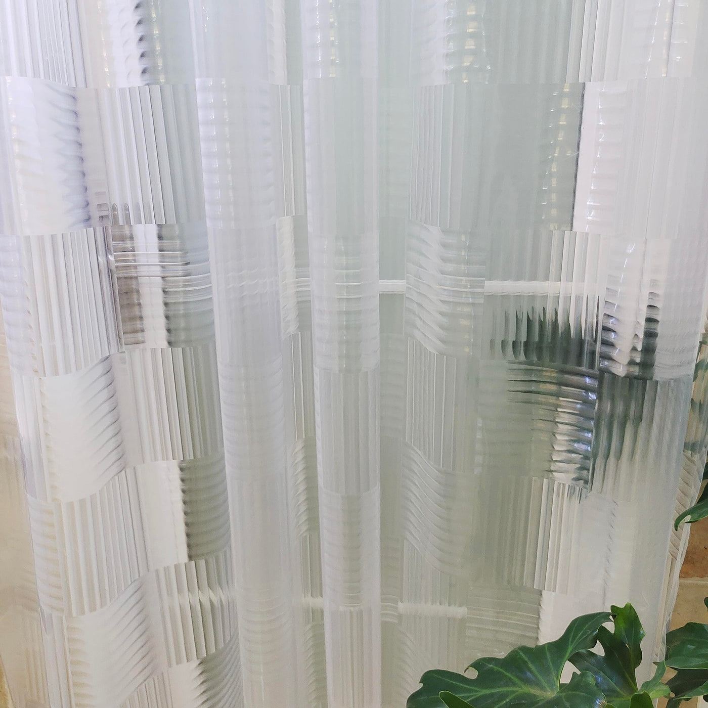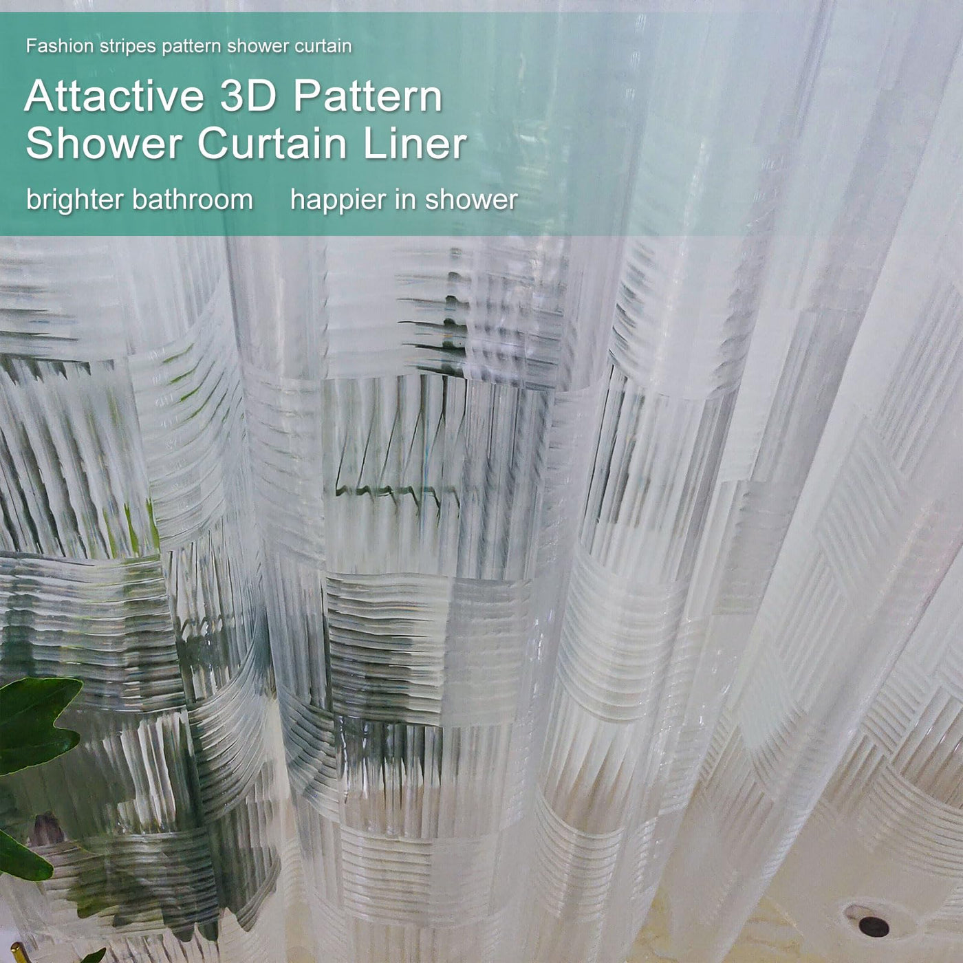 Q: How does the geometric pattern enhance my bathroom's aesthetics?A: The translucent geometric 3D pattern of the shower curtain liner adds a modern touch to your bathroom decor, providing different visual effects depending on the lighting.