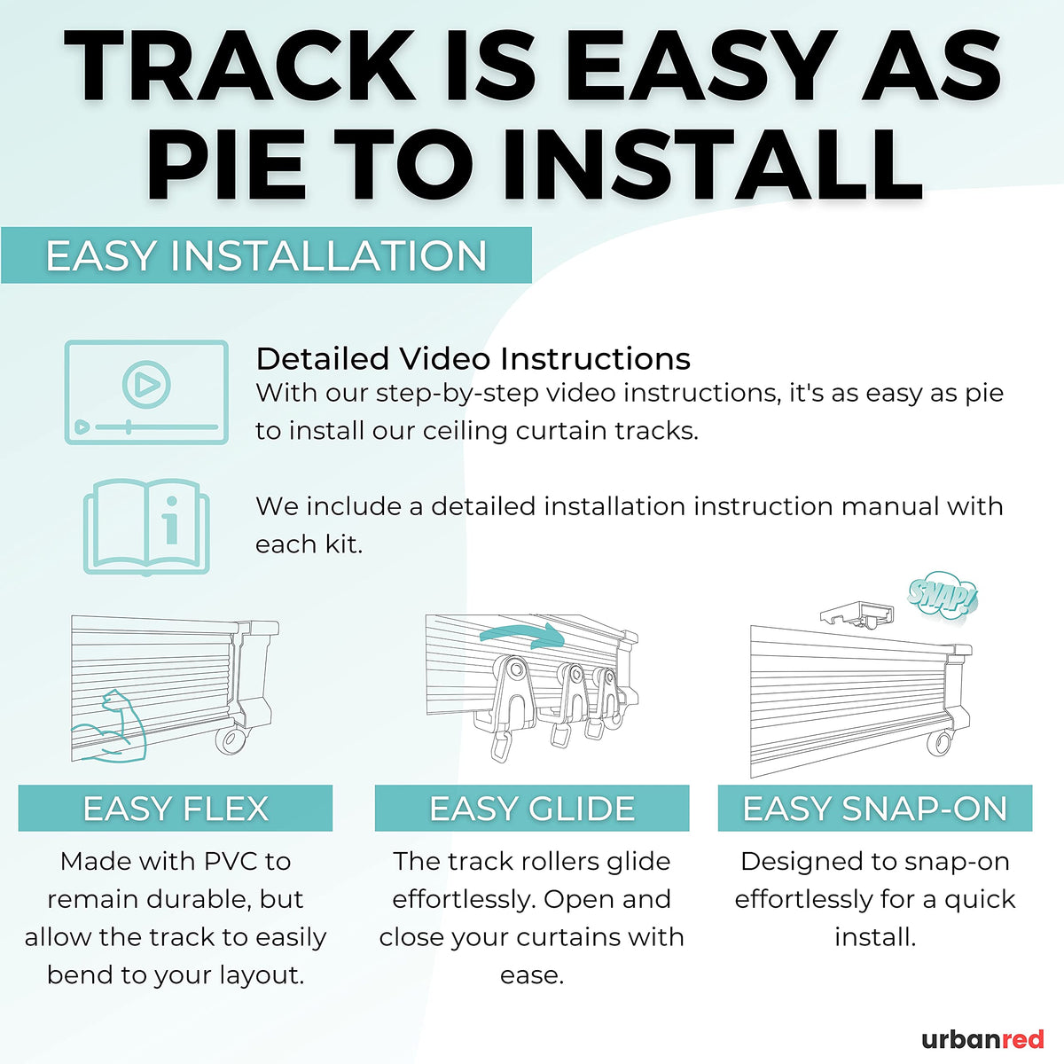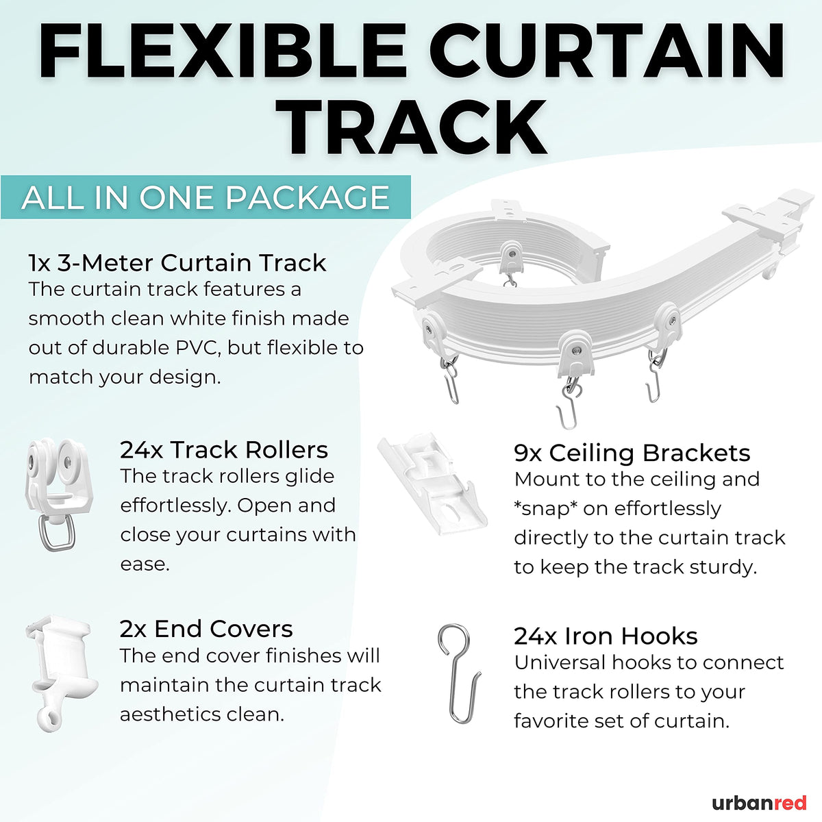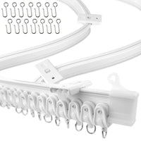FLEXIBLE CURTAIN TRACK FLEXIBLE, BUT DURABLE: This curved ceiling track system can bend and twist to fit a range of window shapes and sizes without the need for any special tools. This plastic curtain track is strong and durable. The plastic is designed to be flexible, but strong enough to not crack or break. PACKAGE INCLUDES: The package includes 1x 3-meter flexible curtain track, 24x track follers, 9x snap-on ceiling brackets, 2x end covers, and required hardware. COMBINE OR CUT DOWN TO SIZE: Extend the curtain tracks together by connecting the ends to form one continuous track. Or cut the curtain track down to size with a fine-tooth hacksaw. INSTALLATION MADE EASY: If you've ever struggled with complicated ceiling curtain rail systems, you will appreciate our track. The curtain track is mounted to the ceiling using snap-on brackets and slide on track rollers for easy installation. The step-by-step instructions make it easy to install the flexible curtain track. Video installation can be found in the image carousel. MULTI-PURPOSE USE: The ceiling flexible curtain track looks great in any setting. The ceiling track and track rollers give this curtain track the ability to open and close with ease. The curtain tracks make the perfect room divider, window treatment or bay, shower track, RV, trailer, motorhome, or any tight spaces to max out your space and gives you instant privacy. GET YOURS TODAY!