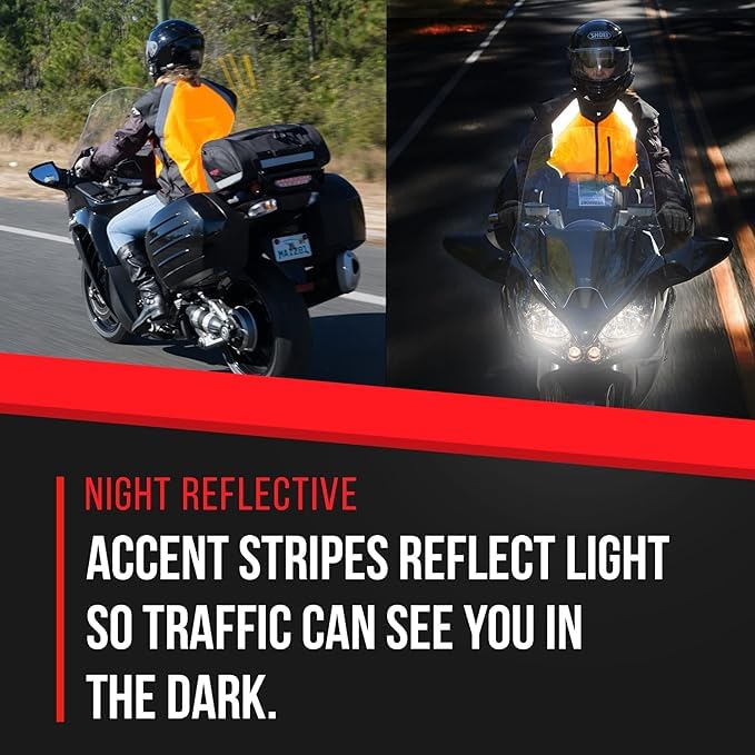 Are you looking for a durable, high quality, Hi Viz motorcycle reflective vest that's attractive & fits snugly over your leather or textile motorcycle jacket without being restrictive?Would you like having the extra safety and confidence of being seen easily in traffic - day or night - without looking like an industrial worker or feeling as though you're wearing a dorky bib? If so, you'll LOVE our new biker vest. (They are motorcycle accessories that also make some of the best gifts) - It helps you be seen in traffic and at night, and lets do it in comfort & style. This vest is also perfect for military base use. Available in your choice of 2 bold colors that stand out during the day, each vest also has multiple flective stripes that shine brightly at night. Made especially for savvy bikers. We've added some extra length so you won't feel like it rides halfway up your chest like so many other Hi Vis garments do. The straps on both sides are individually adjustable so you can enjoy a comfortable custom fit without the sides flapping around in the wind when you ride at high speed. Once you've adjusted the sides to your liking you can just leave them alone. It has a full zip front for convenience - and also a zipper chest pocket for easy access to small items. We've tested the fit over several motorcycle jackets, and it's easily adaptable to most leather, textile or mesh riding jackets. You can wear it over a leather motorcycle vest or just your normal clothes, just be sure to order a size or 2 smaller if you aren't planning on wearing it over a jacket. Suitable for touring, adventure and street riding, it even works great for ATV use or hunting. The possibilities are endless. We hope you find it as useful as we do! As with all Badass Moto Gear products & motorcycle accessories, there is NO risk! Your satisfaction is 100% guaranteed with this product.