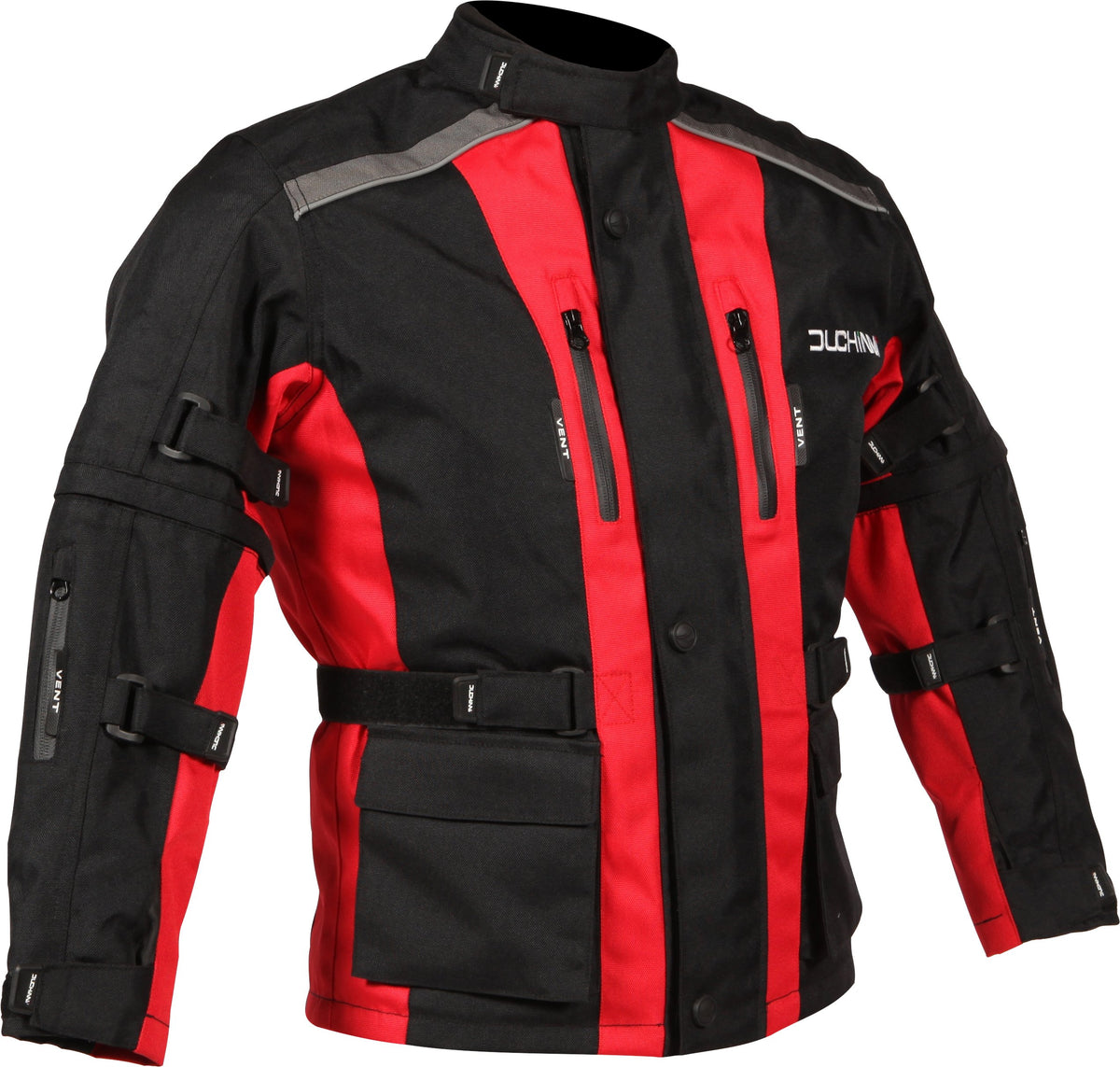 It’s a family affair. Jago gives you total peace of mind with its durable, secure and highly visible design. Ensure your precious cargo is covered. DUCHINNI JAGO children's motorcycle riding jacket has adjustable sleeve lengths to compensate for growth. It has an abrasion resistant outer shell, fixed waterproof liner and a removable Thermo Mix insulating liner as well as vents with zipper closure making it a versatile year round option. Fitted with 5 piece removable CE approved shoulder, elbow and back armor. Approximate size guide: XS 6-7 years, SM 8-9 years, me 9-10 years, LA 10-12 years, XL 12-14 yrs.