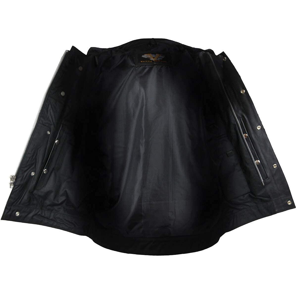 Show Your Club Pride With This Popular Vest With Plenty Of Room For Patches. It Comes With A Back Panel Made Of A Single Piece Of Leather So It Would Be Great For Adding All Those Patches. 5 Snaps With Zipper Front Closure To Keep You Nice And Warm When Riding On Short Trips Or Long Ones. This Vest Has A Nylon Liner With An Orange Trim. The Vest Comes With A Mandarin Style Collar, With 2 Gun Pockets On The Inside And 2 Outside Front Snap Style Chest Pockets.