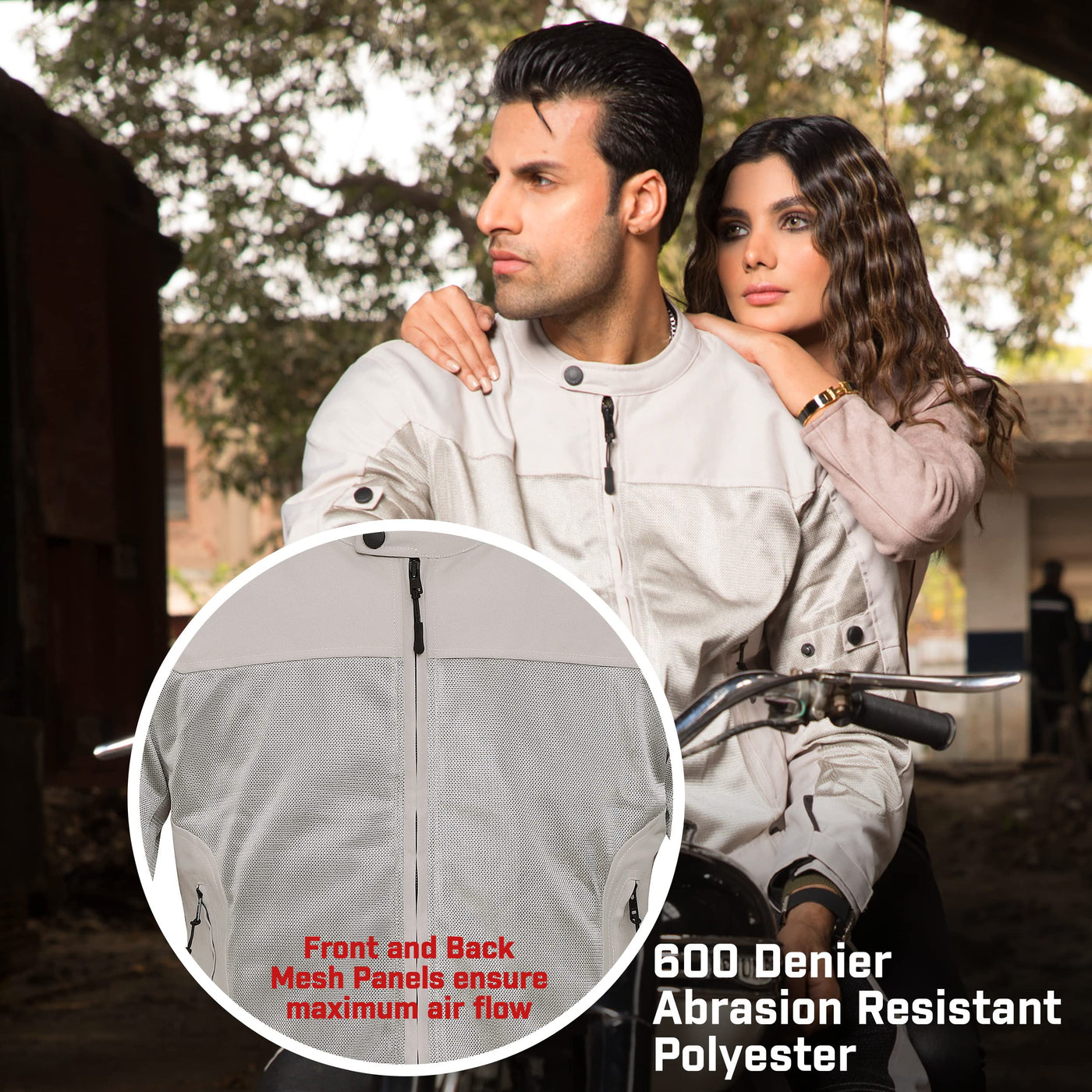 Q: What materials are used in the construction of this motorcycle jacket?A: The jacket is made from 600 Denier Abrasion Resistant Polyester and breathable air mesh panels, ensuring durability and comfort while providing excellent airflow to keep you cool.