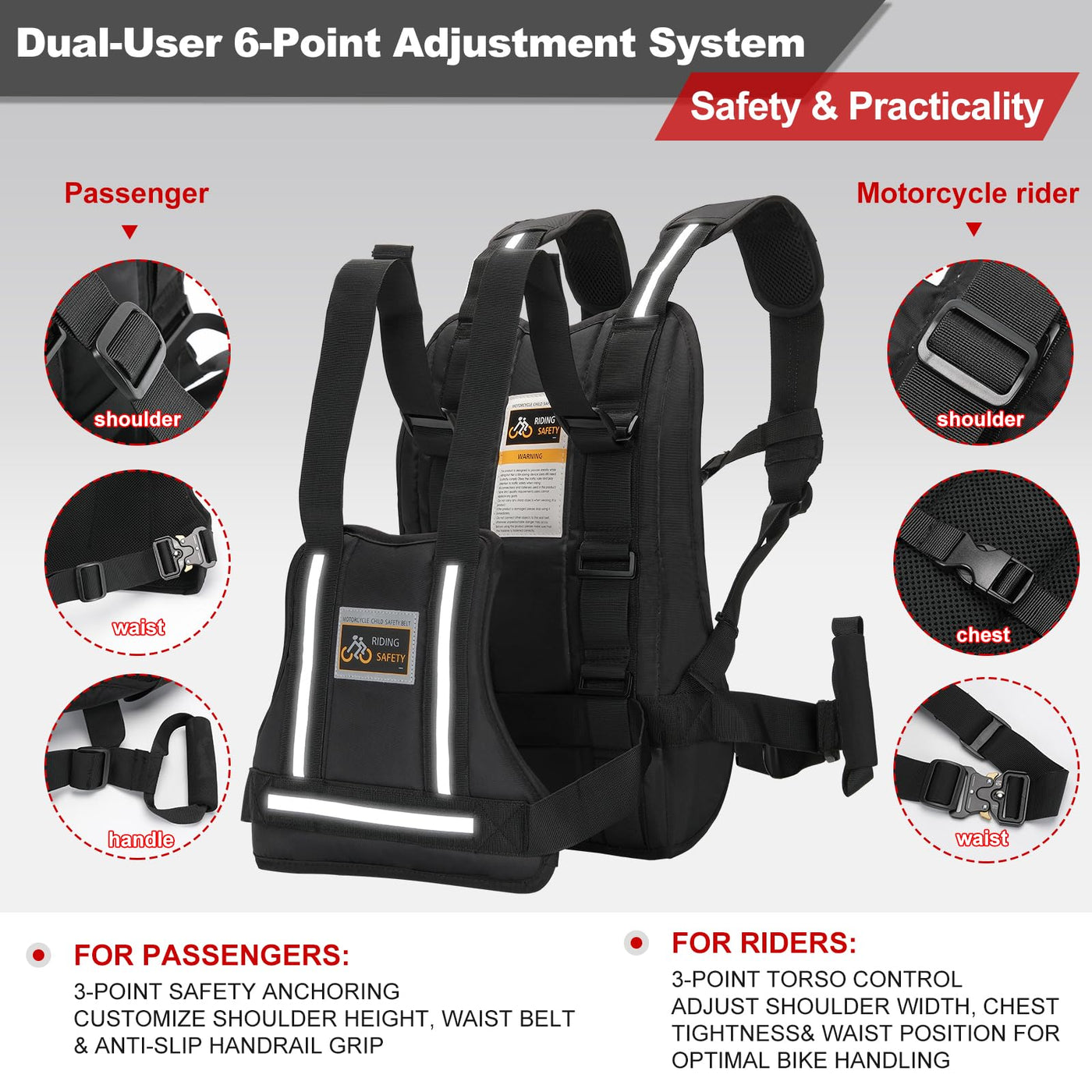 Additional Features: 3D Breathable Lining: Made from high-density webbing and sandwich composite sponge, our harness is comfortable, breathable, and safe, relieving shoulder and waist pressure during rides. Quality Assurance: We offer a two-year money-back guarantee and 24-hour online customer service to ensure your satisfaction. Versatile and Reliable: Whether youre riding on motorcycles, ATVs, or snowmobiles, our harness meets all safety standards for passengers, ensuring a healthy and breathable experience. Usage Scenarios Built for: Highway motorcycle touring Off-road ATV adventures (mud/water resistant) Snowmobile operations in -30C conditions Theme park ride safety enhancement Order Now: Equip your family with the ultimate motorcycle harness for safety, comfort, and adventure on the road!
