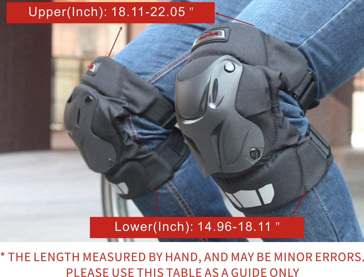 Q: What size range do the knee guards accommodate?A: These knee guards are designed to fit a calf circumference of 14.96 inches to 18.11 inches and a thigh circumference of 18.11 inches to 22.05 inches, ensuring a secure and comfortable fit for various users.