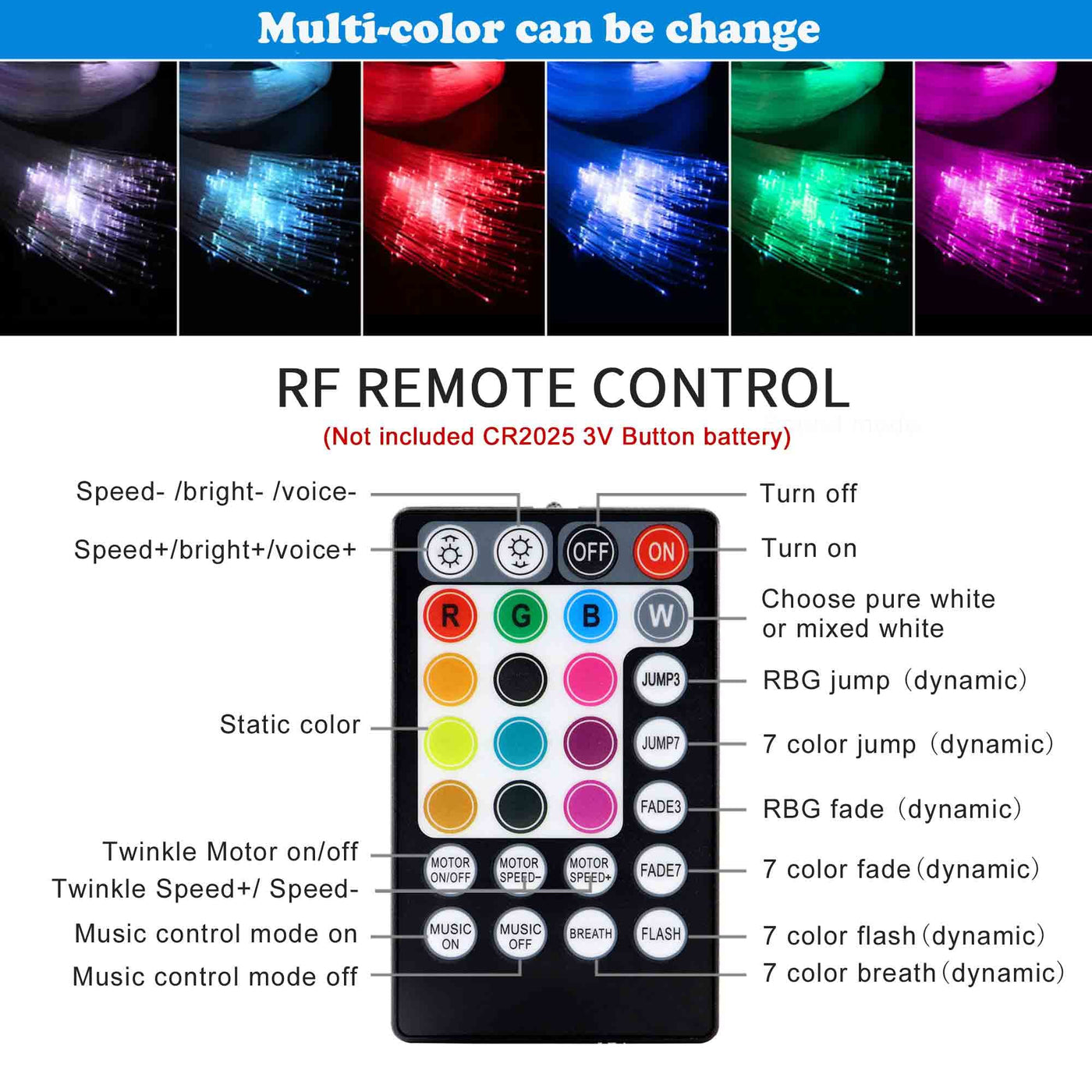 Parameter For 10W Twinkle Light Engine : Power:10W Voltage: Ac85V-265V / Dc12V Led Chip: Rgbw Led Working Temperature Of Fiber: -58°F - 167°F Lifetime : Projector=50,000 Hours, Fiber Optic Bundle=10 Years Package Included: 1 X 10W Rgbw Light Engine 1 X Rf Controller ( Not Included Battery Of Remote : Cr2025 3V Button Battery ) 1 X Car Cigarette Plug 1 X Power Adapter 1 X Connectors 1 X User Manual 3 X Drill Bits (Diameter 0.8Mm 1Mm 1.5Mm)