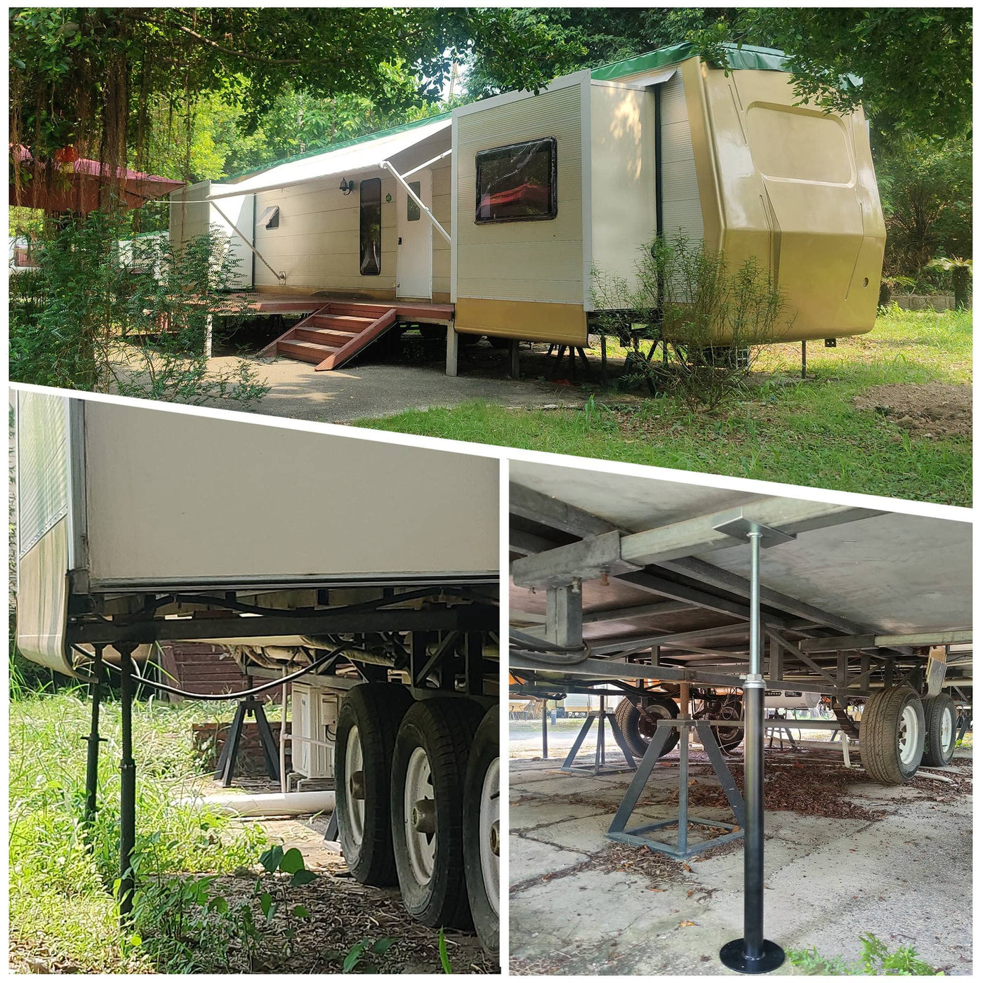 USING THE RV Slide Out Support Jacks: 1. Park the trailer on a level surface capable of sustaining the load. Chock all wheels to prevent the trailer from rolling. 2. Disconnect your towing vehicle and move it away. 3. Level the trailer. Place RV Slide Out Support Jacks under the trailer to support it while installing the stabilization jacks. 4. The RV Slide Out Support Jacks must be connected to a solid part of the frame such as a rail. The connection point must also be large enough for the bracket. 5. Check that the jacks bracket is in the correct location. 6. From the lowest setting and then lift to the proper height, use the folding handle to raise the bracket slowly to meet the RV slide out supports bars. It is suggested to Place one or more leveling blocks on the ground beneath the stabilizer jack.