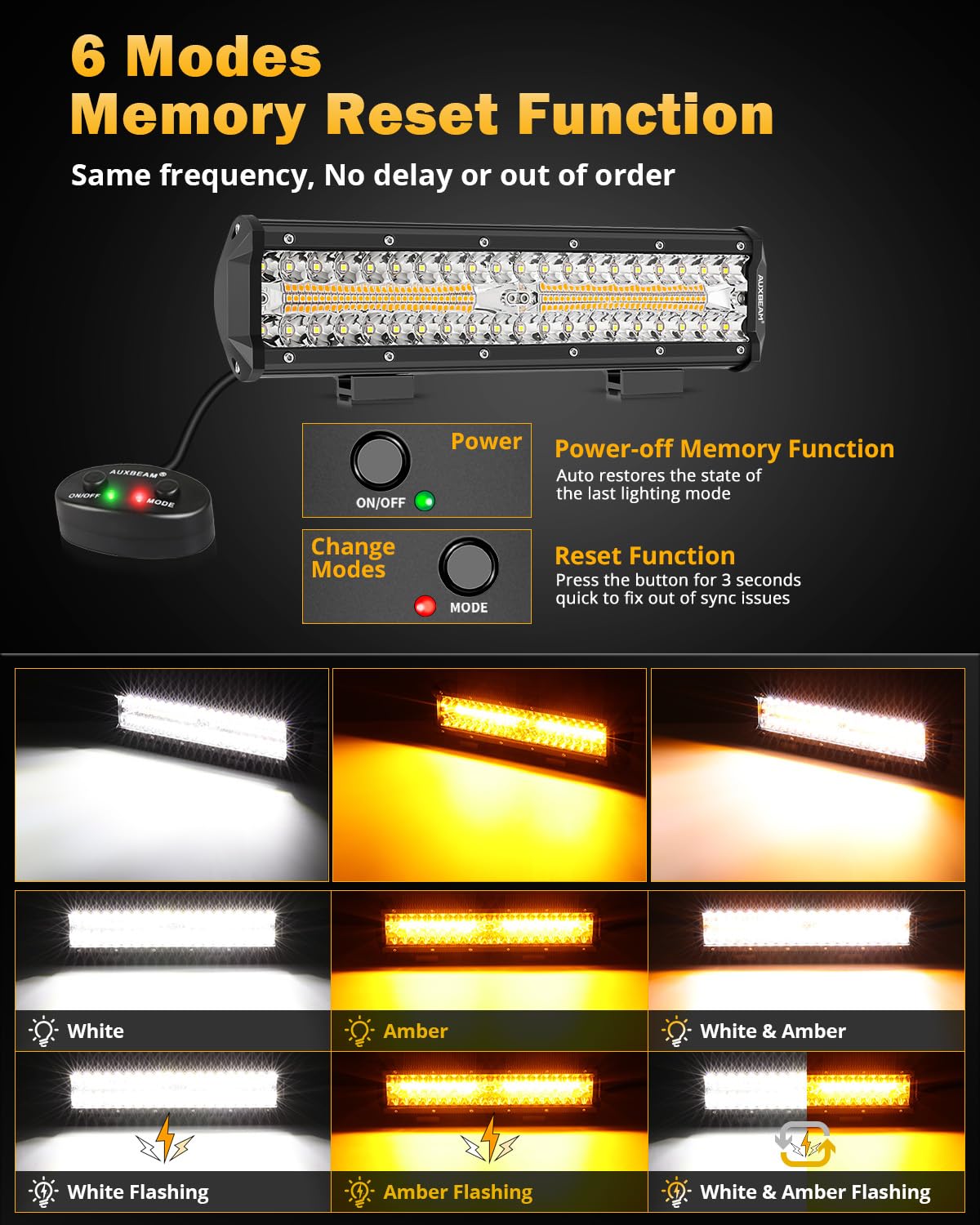 Q: What are the different modes of the Auxbeam 12 Inch LED Light Bar?A: The Auxbeam 12 Inch LED Light Bar features six different modes: 1) white driving light, 2) amber fog light, 3) white & amber light, 4) white flashing light, 5) amber flashing light, and 6) white & amber strobe light.