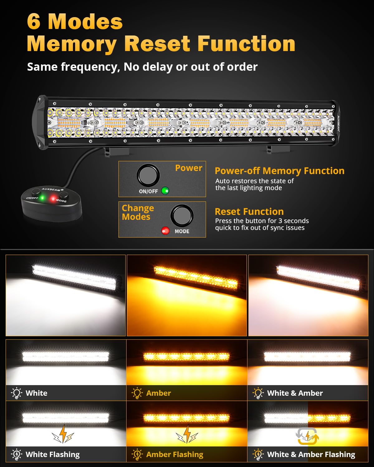 Q: What are the different light modes available in the Auxbeam 20 inch LED Light Bar?A: The Auxbeam 20 inch LED Light Bar features six different modes: white driving light, amber fog light, white & amber light, white flashing light, amber flashing light, and a white & amber strobe light. This versatility allows you to adapt the lighting to various driving conditions.