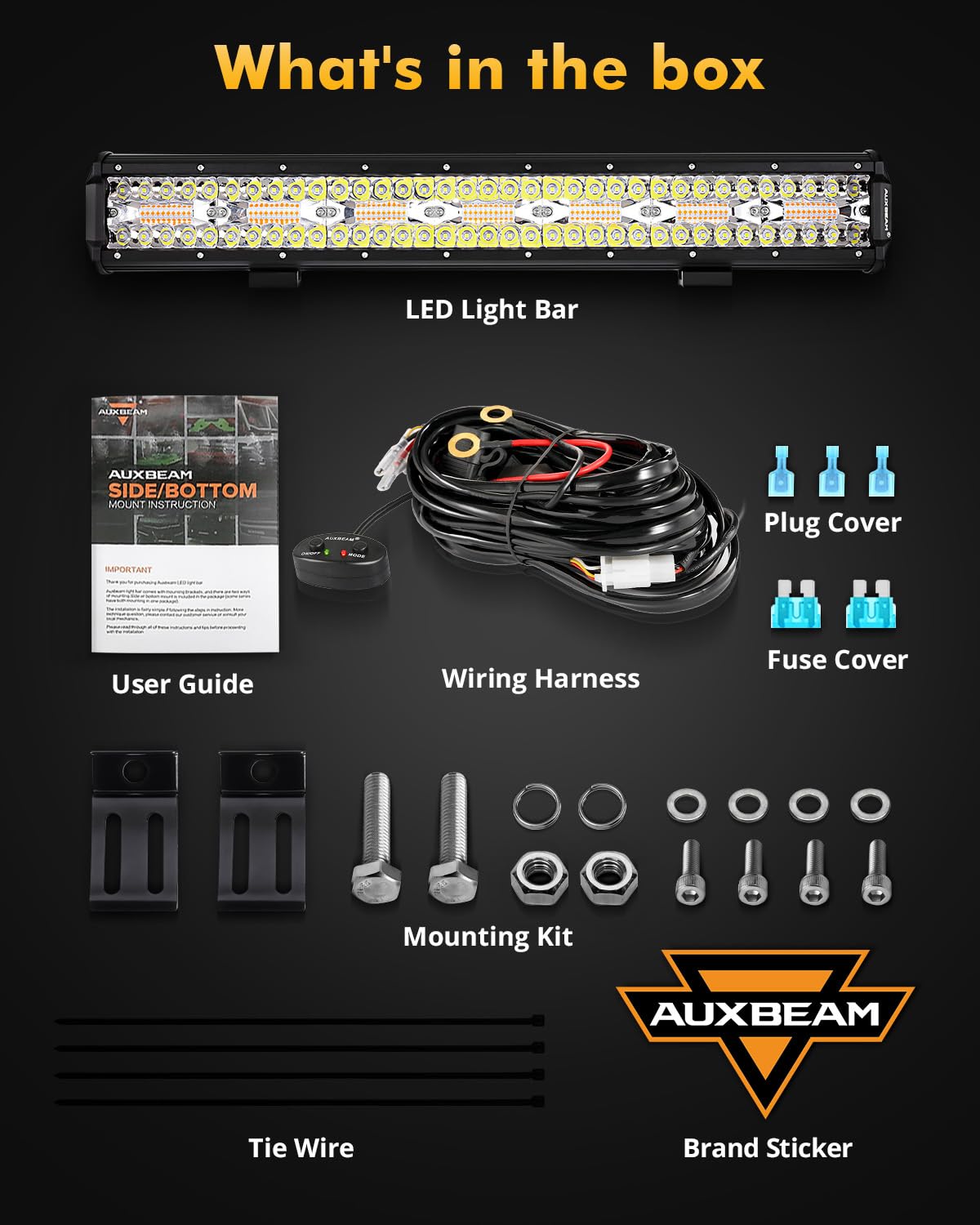 Q: What comes included in the Auxbeam LED Light Bar package?A: The package includes one 20 inch LED Light Bar, a 10FT customized wiring harness with one lead, and a set of mounting accessories. This comprehensive package provides everything you need for installation right out of the box.
