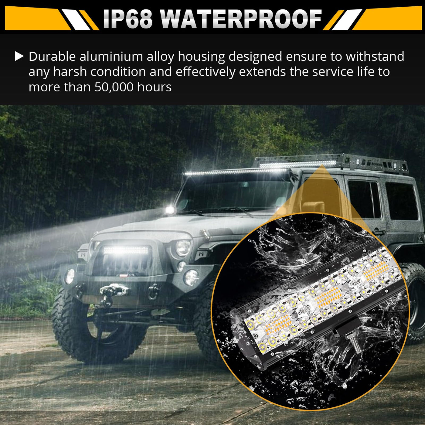 Q: What is the material of the light bar, and how does it impact durability?A: The Auxbeam LED light bar is constructed from high-quality aluminum, ensuring durability and resistance to corrosion, making it suitable for various weather conditions.