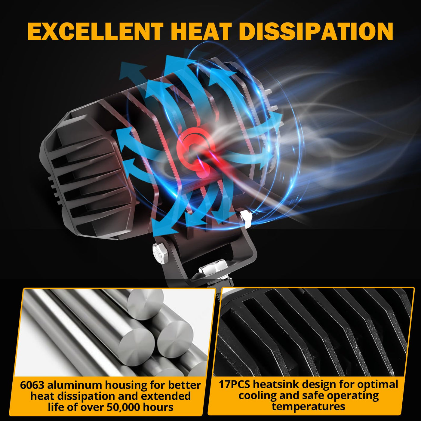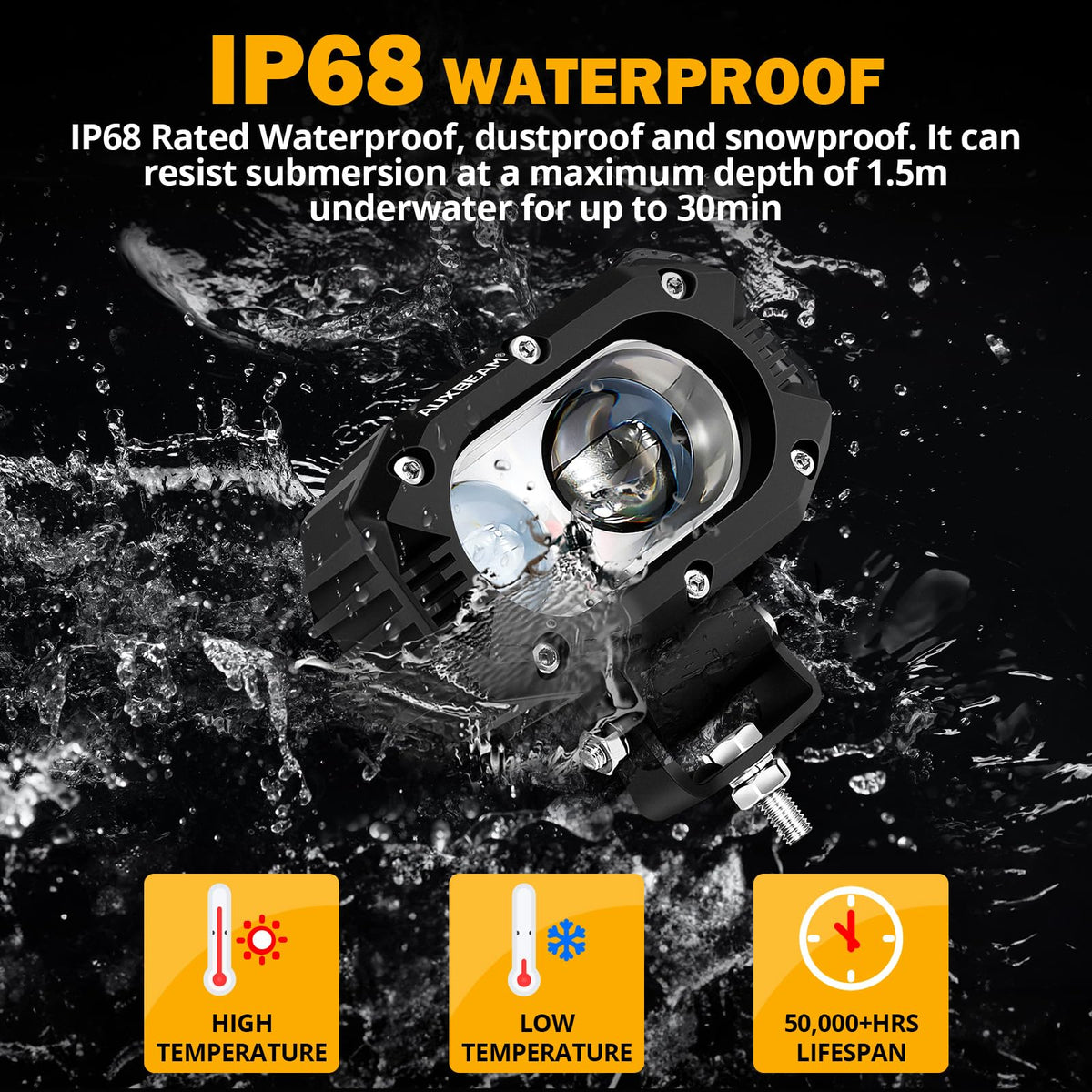 Q: What are the key features of the Auxbeam 4 Inch LED Square Pod Light?A: The Auxbeam 4 Inch LED Square Pod Light features super bright 2*30w high intensity 5050 LED chips, a specially designed 12D optical lens for a 15° white spot beam, IP68 rating for water and dust resistance, and an aluminum housing for effective heat dissipation, ensuring durability and a lifespan of over 50,000 hours.